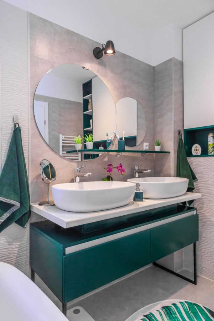 În bucătărie sunt linii drepte și simple. Mobilierul e alb cu accente de verde-smarald și are deschideri de tip push-on sau mânere ascunse. Blatul de lucru este unul generos în formă de „L”, de culoare gri beton, iar toate electrocasnicele sunt incorporate, pentru unitate. Cât despre finisaje, Andreea a optat pentru gresie porțelanată de la Delta Studio.