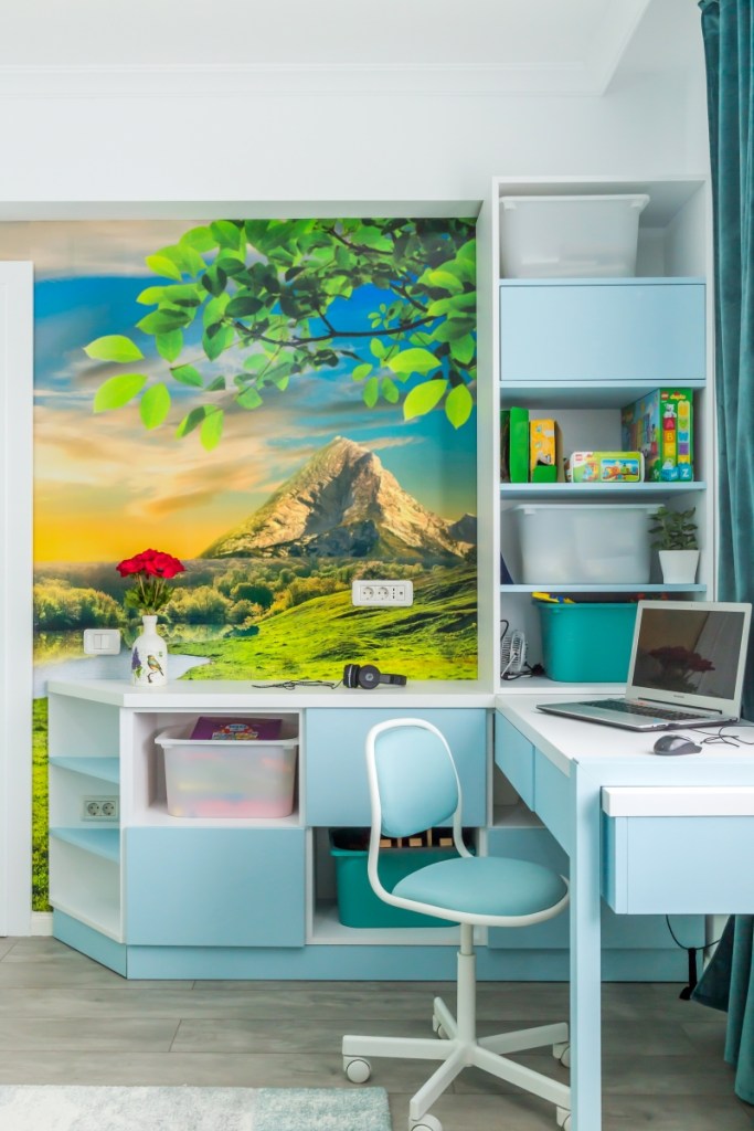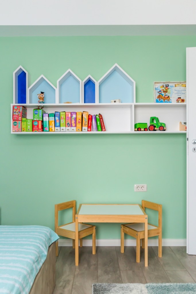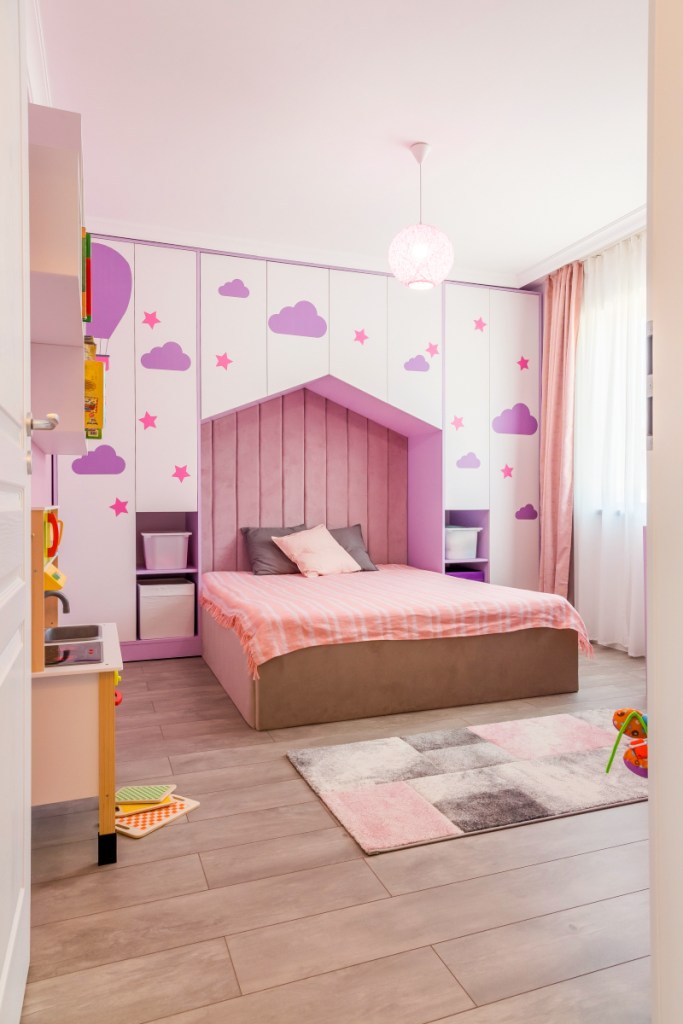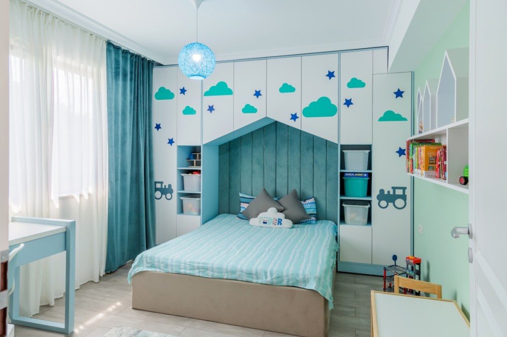 Dormitoarele copiilor au tot un stil fresh, dar conturează o lume imaginară de basm pentru cei mici, folosind culori pline de viața. Nuanțele predominante sunt albastru – în cazul dormitorului pentru băiețel, și roz pastel – pentru dormitorul celor două fetițe. „Cea mai mare provocare a fost dormitorul fetițelor, pentru că totul a fost la dublu – dulapuri, birou, spațiu pentru joacă – elemente pe care a trebuit să le gândesc în așa fel încât să nu încarc prea mult camera”, povestește Andreea.