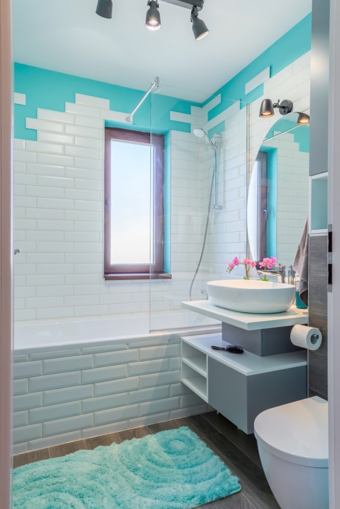 Baia comună dormitoarelor celor mici emană un aer jucăuș și energic datorită faianței aplicată dinamic pe perete.