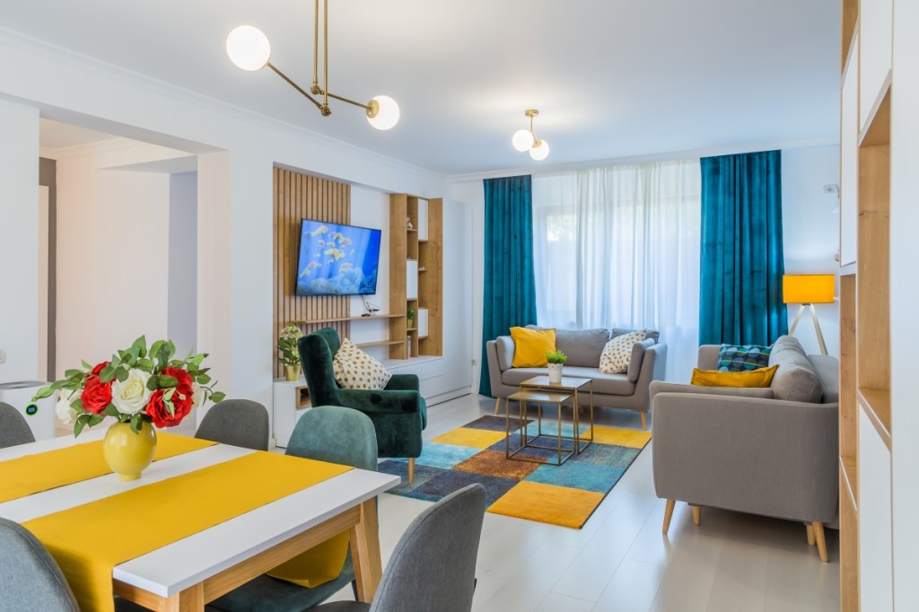 Fotoliul și cele două canapele sunt cumpărate de pe Vivre.ro; cea cu trei locuri este extensibilă, dar nu și cea cu două locuri. Masa de dining este extensibilă, e realizată din lemn de stejar și MDF, fiind cumpărată de pe TheHome.ro cu puțin peste 1.000 de lei.
