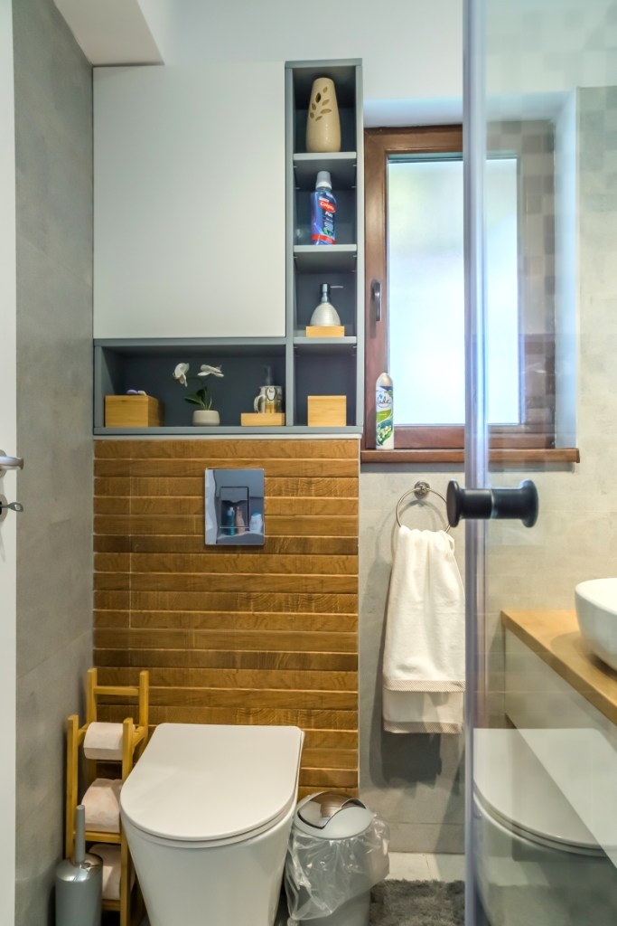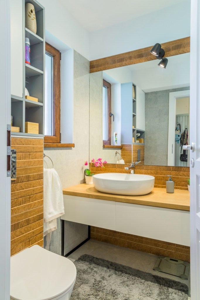 Baia de la parter este finisată cu plăci ceramice care reproduc textura caldă a lemnului și cea rece a betonului – asociere care creează o ambianță primitoare. Aici Andreea a optat pentru obiecte sanitare freestanding, precum și un duș walk-in îmbrăcat cu mozaic.