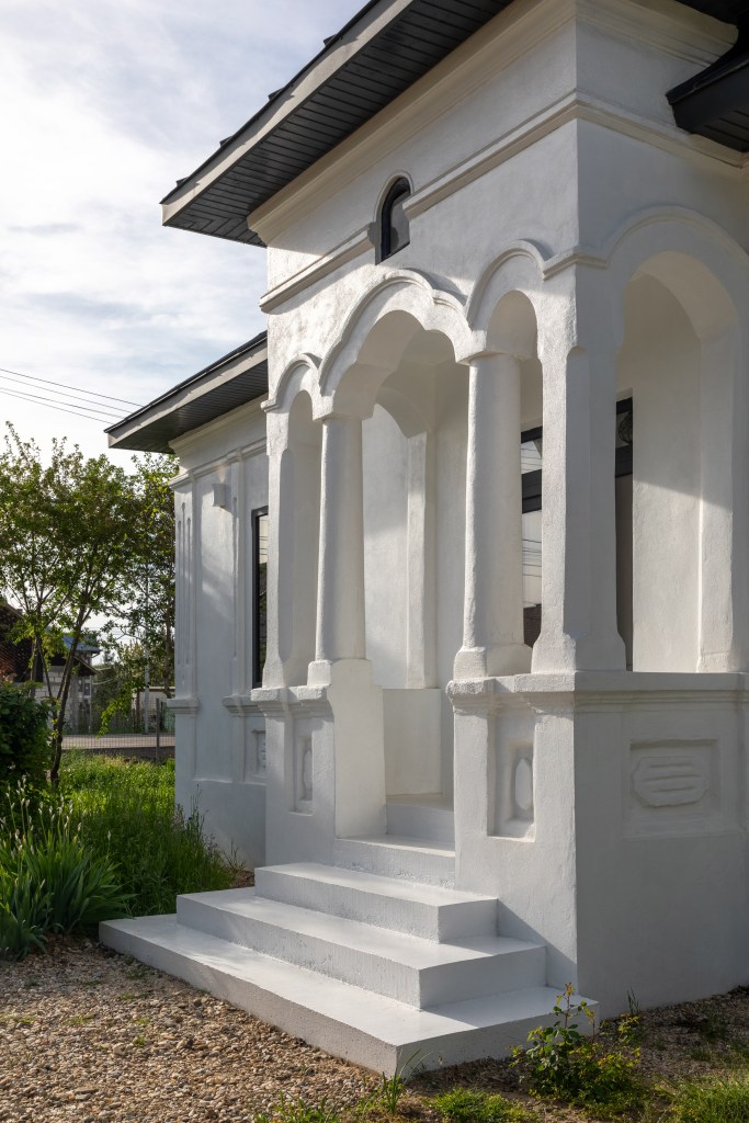Casa, construită în jurul anului 1930, este moștenire de familie și fusese abandonată pentru șapte ani când au început lucrările. Perioadă de abandon care a dus la degradarea sa rapidă, dar fără să distrugă structura. După câteva discuții purtate cu arhitectul Silviu – Alexandru Preda, beneficiarii s-au gândit la o metodă de abordare care să presupună cât mai puține intervenții. S-a mers pe ideea de consolidare și pe păstrarea cât mai multor elemente originale de arhitectură, cu reparații doar acolo unde era neapărată nevoie. Poziționarea casei a influențat mult direcția proiectului. Biserica, aflată în imediata apropiere, a determinat culoarea exteriorului. Alegând albul pentru fațadă, casa a devenit, cel puțin la nivel vizual, parte din ansamblul bisericii, fiind stilizată ca o machetă de ipsos la scara unu la unu.