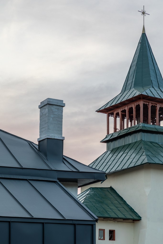 Renovarea casei a presupus intervenții minimale. În primul rând, a fost schimbat acoperișul. S-a optat tot pentru o învelitoare de tablă, foile fiind îmbinate la fel ca în trecut. Jgheaburile și burlanele au fost înlocuite prin realizarea unui sistem de drenare al apei perimetral. Tehnica, folosită mult în Japonia, face ca scurgerea apei să fie „la picătură”, pe tot perimetrul casei.