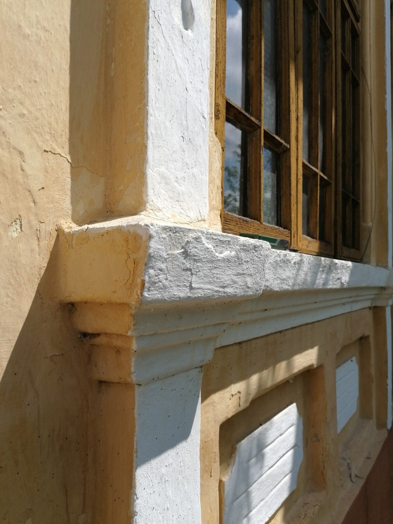 Tâmplăria a fost și ea schimbată și este, probabil, elementul cel mai vizibil la final de șantier. Alegerea ferestrelor a fost privită ca un accent al contemporaneității, în dialog cu învelitoarea de tablă și în contrast cu fațada casei. Beneficiarii și-ar fi dorit să păstreze tâmplăria originală, dar recuperarea ei a fost imposibilă. O atenție deosebită a fost acordată păstrării decorațiilor exterioare. Refacerea detaliilor de pe fațadă s-a realizat într-o manieră inedită, „zgâriind tencuiala”. A fost păstrat modelul inițial, dar mai riguros, fiind vorba de decorații standard, realizate după șablon. Casa este locuită temporar, așa că beneficiarii au hotărât să nu o anvelopeze cu termosistem pentru a-i păstra proporțiile arhitecturale și decorațiile fațadei.