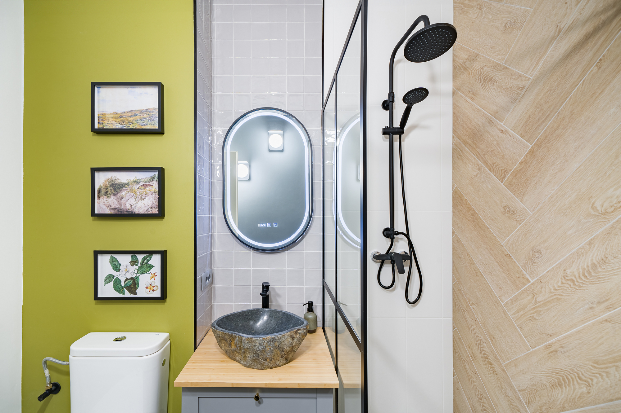 De la băi cu design minimalist, complet alb, până la amenajări cu tapet suprapus cu ceramică și pereți colorați.