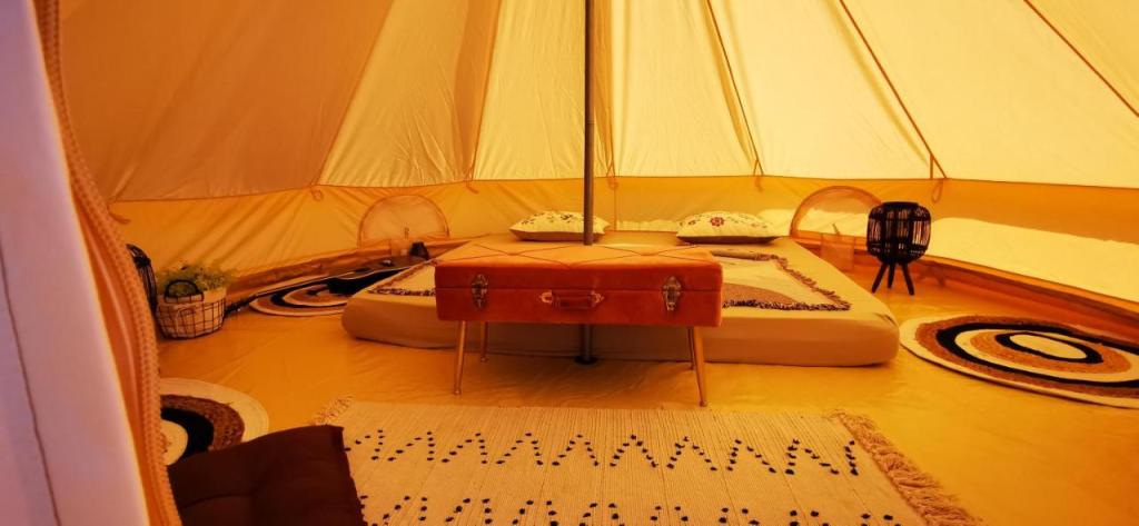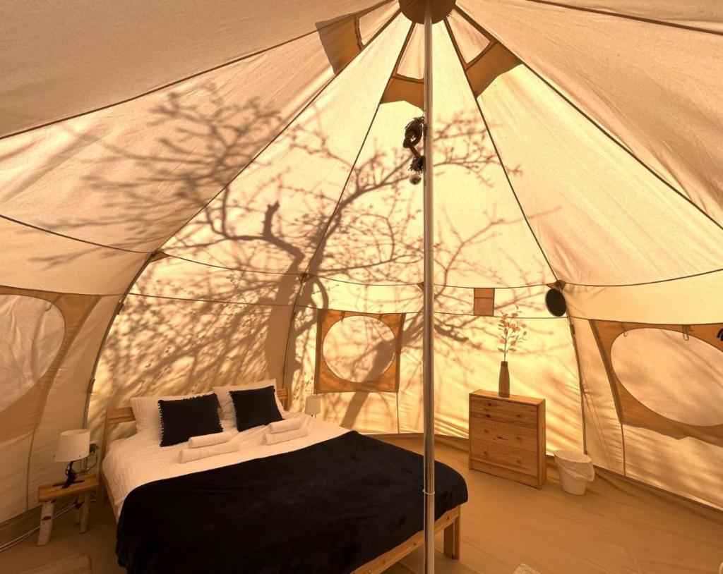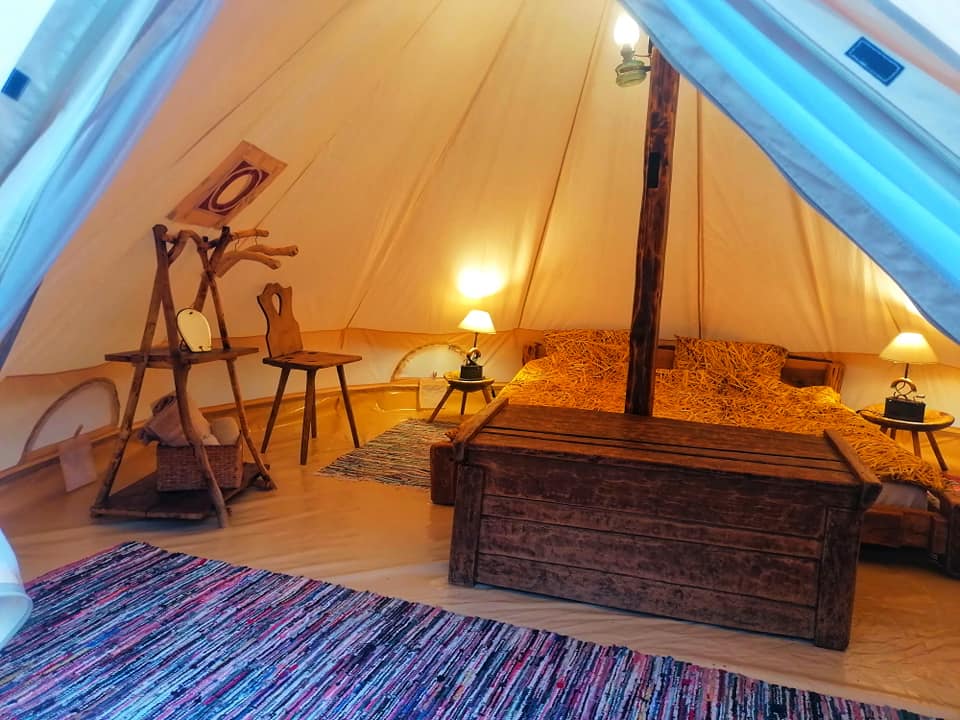 Glampingul dispune de cinci corturi cu pat dublu matrimonial, cu saltea premium și lenjerie de pat. Corturile te așteaptă cu prosoape curățate și igienizate în prealabil într-o curățătorie profesională. În apropiere, există o bucătărie utilată complet, în care se servește micul dejun și în care oaspeții au posibilitatea de a-și pregăti orice își doresc.