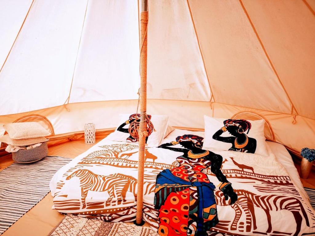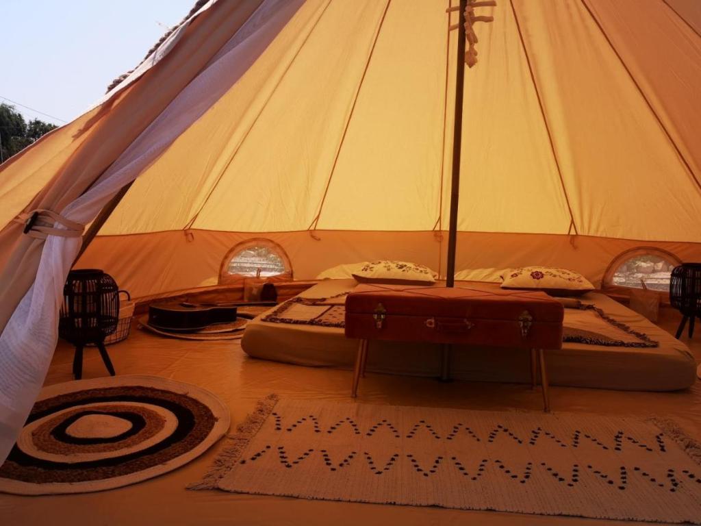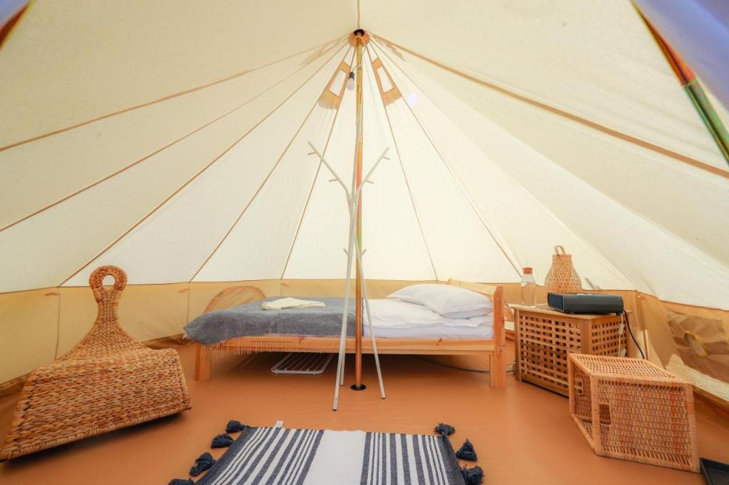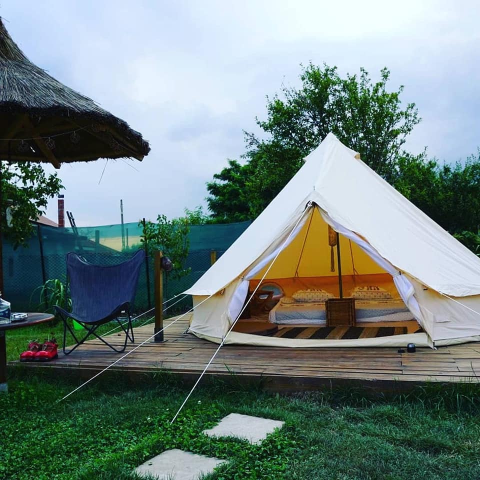Curtea în care sunt amplasate corturile de lux te îmbie cu o atmosferă boemă și este amenajată cu atenție la detalii, la fel ca interioarele corturilor. Aici, pe lângă saltelele confortabile, oaspeții găsesc perne și felinare, iar spațiul din fața cortului este amenajat cu fotolii, măsuță, hamac, priză pentru încărcător si uscător pentru prosoape.