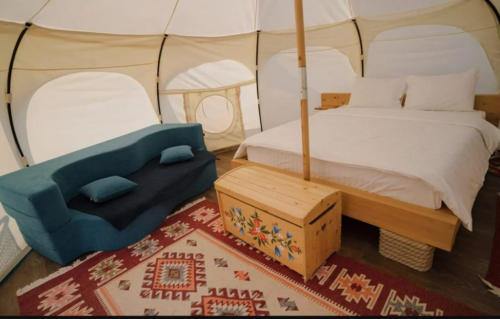 Corturile sunt amplasate pe o platformă din lemn, iar tu te poți odihni într-un pat la fel de confortabil ca cel de la hotel, într-un interior cu mobilier din lemn lucrat manual, veioză, prize și chiar și-un șemineu.