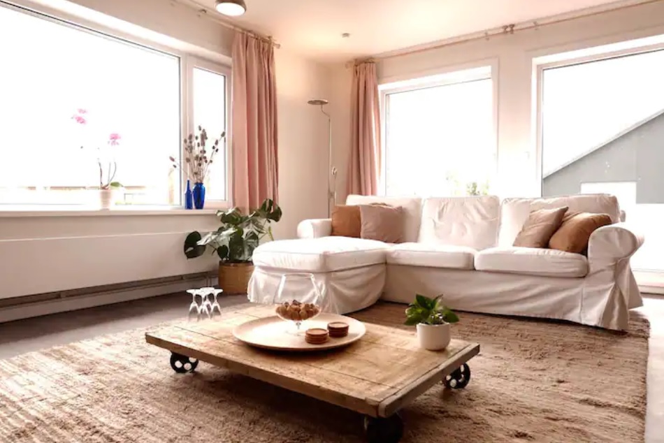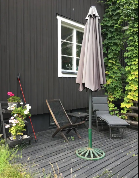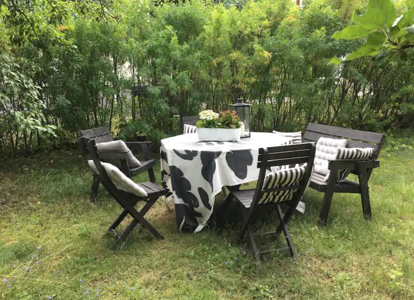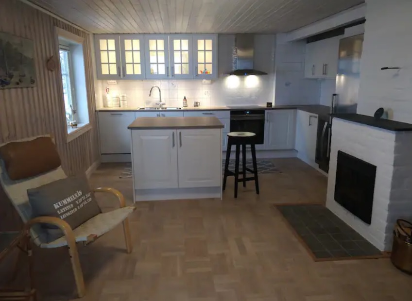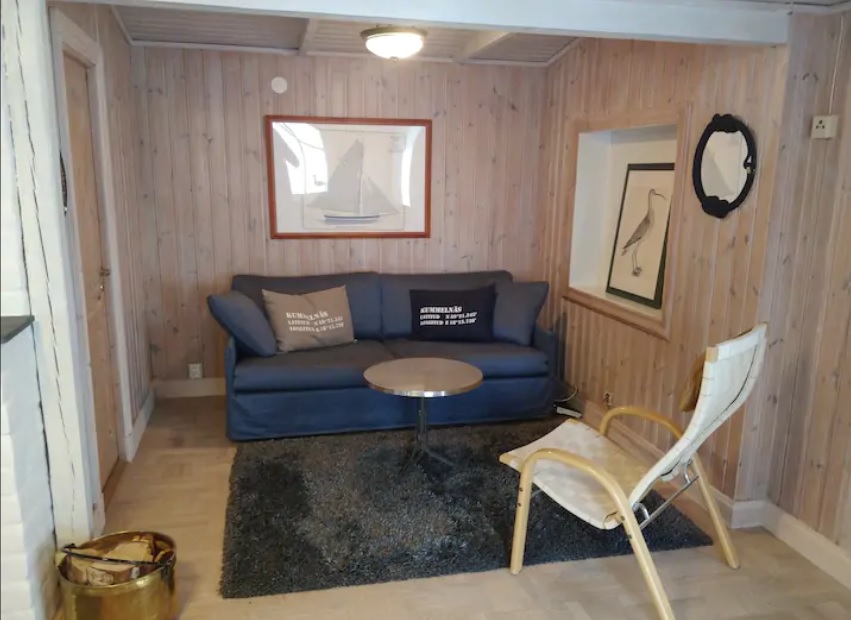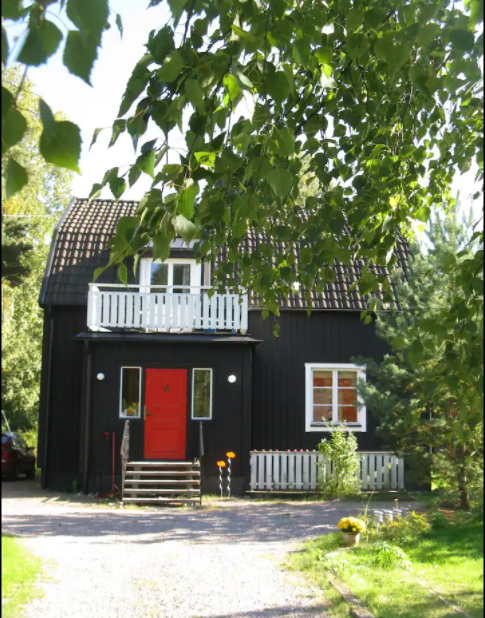 Tot o locuință tipic nordică am căutat să fie și această a doua opțiune de cazare. Și-am găsit, de data aceasta, o căsuță cu fațadă neagră, dar cochetă. Situată la 12 kilometri de centrul orașului, această casă fermecătoare din lemn a fost construită în 1928, cu o terasă îndreptată spre sud și o grădină spațioasă de jur împrejurul ei.