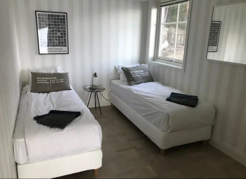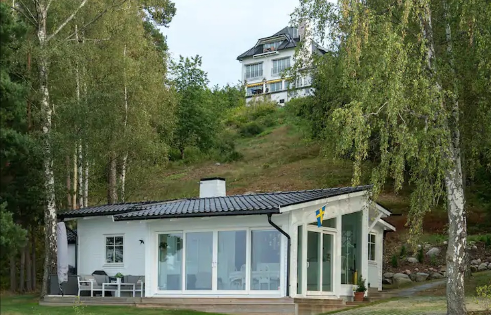 Casa cu un dormitor și un living, cu fațadă albă tipic nordică, este situată la 20 de kilometri de Stockholm, într-un peisaj natural de vis pentru cei care iubesc marea chiar și iarna.