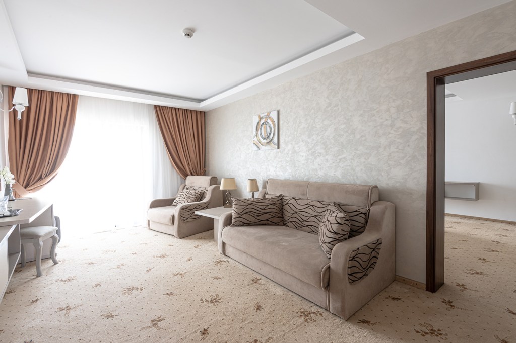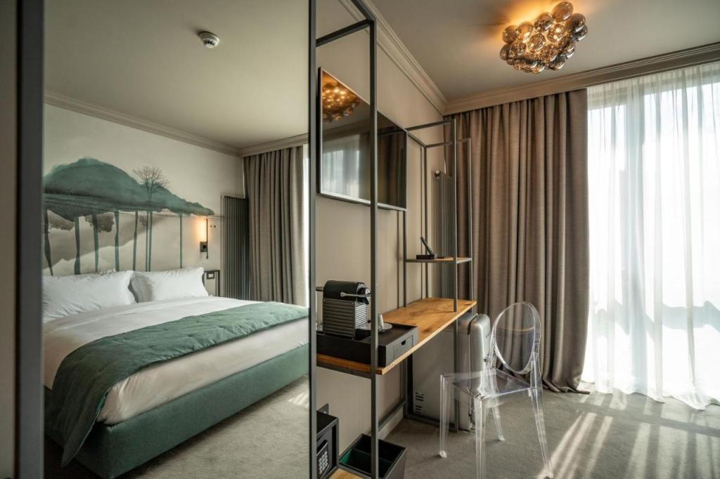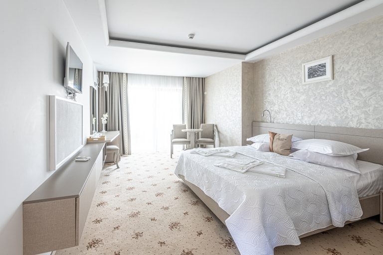 Toate camerele și apartamentele din hotel sunt decorate elegant și echipate cu bucătărie, Smart TV și balcoane generoase, iar prețurile din luna martie pornesc de la circa 600 lei, cu mic dejun inclus.