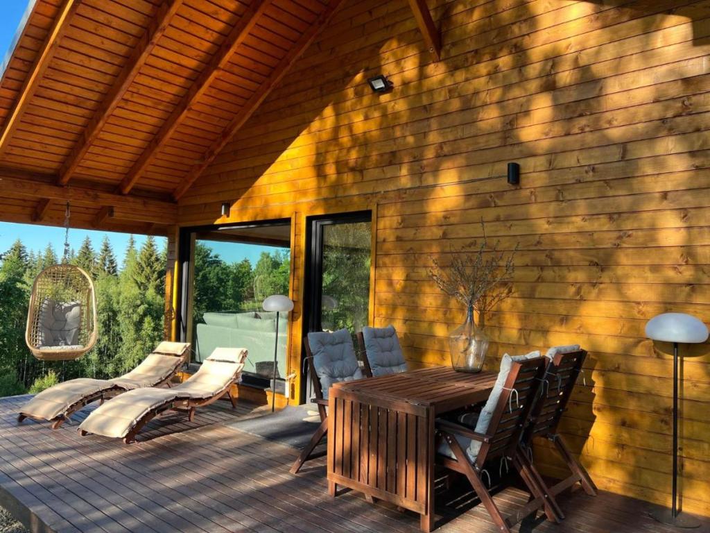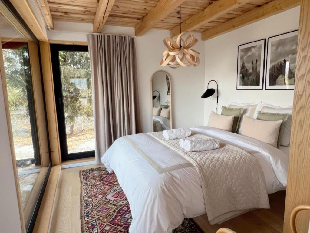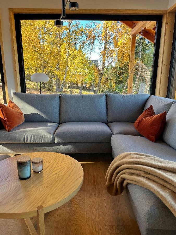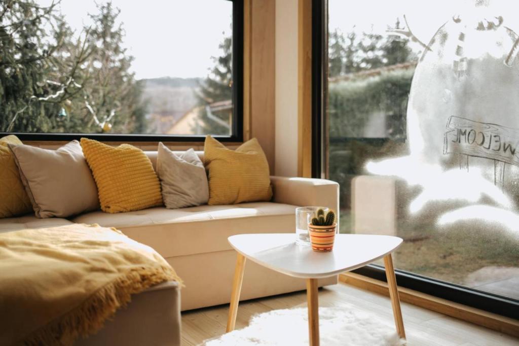 La parter se află un living mare cu șemineu și o zonă de luat masa, amplasate astfel încât să te poți bucura de priveliște din toate unghiurile camerei. Dormitorul se află tot la parter, cu geamuri până în podea care dau, la rândul lor, spre natura din jur. Elementul central al cabanei sunt ferestrele mari, dispuse strategic pentru a oferi oaspeților o vedere spectaculoasă spre pădure.