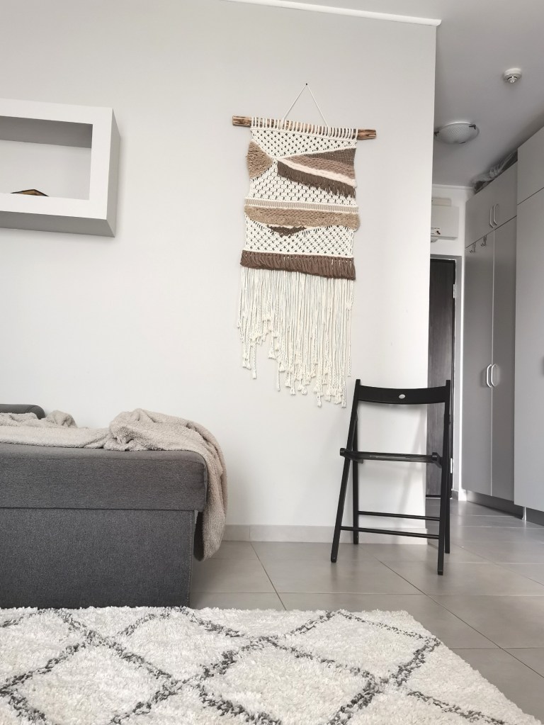 „Back to Basics” este o decorațiune modernă, alcătuită din elemente geometrice și realizată din șnur bumbac natur, pe suport de creangă curățată, 83/160 cm.