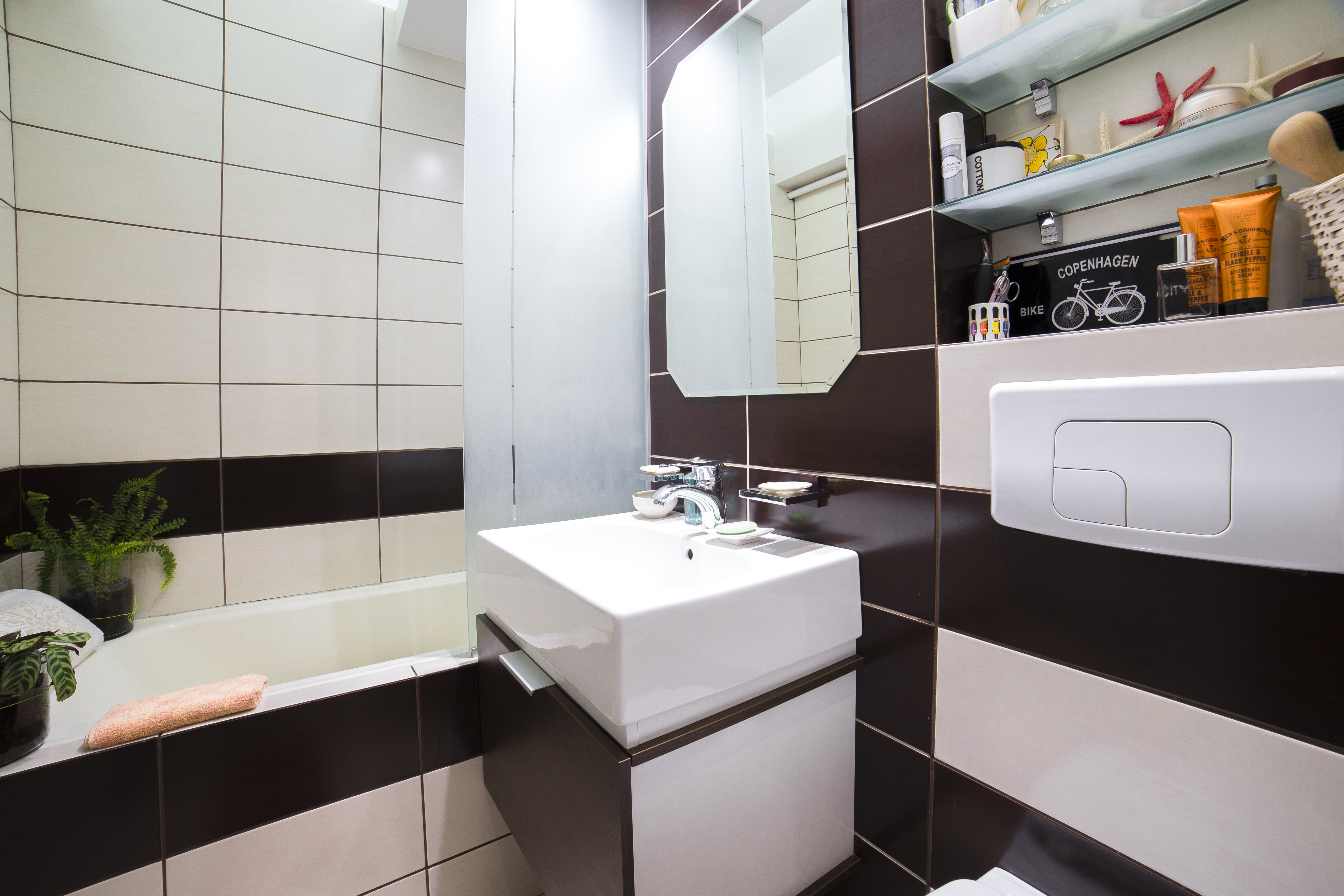 Baia este amenajată în două culori (alb și un maroniu-roșcat), iar spațiile de depozitare au fost integrate în așa fel încât să nu aglomereze spațiul.