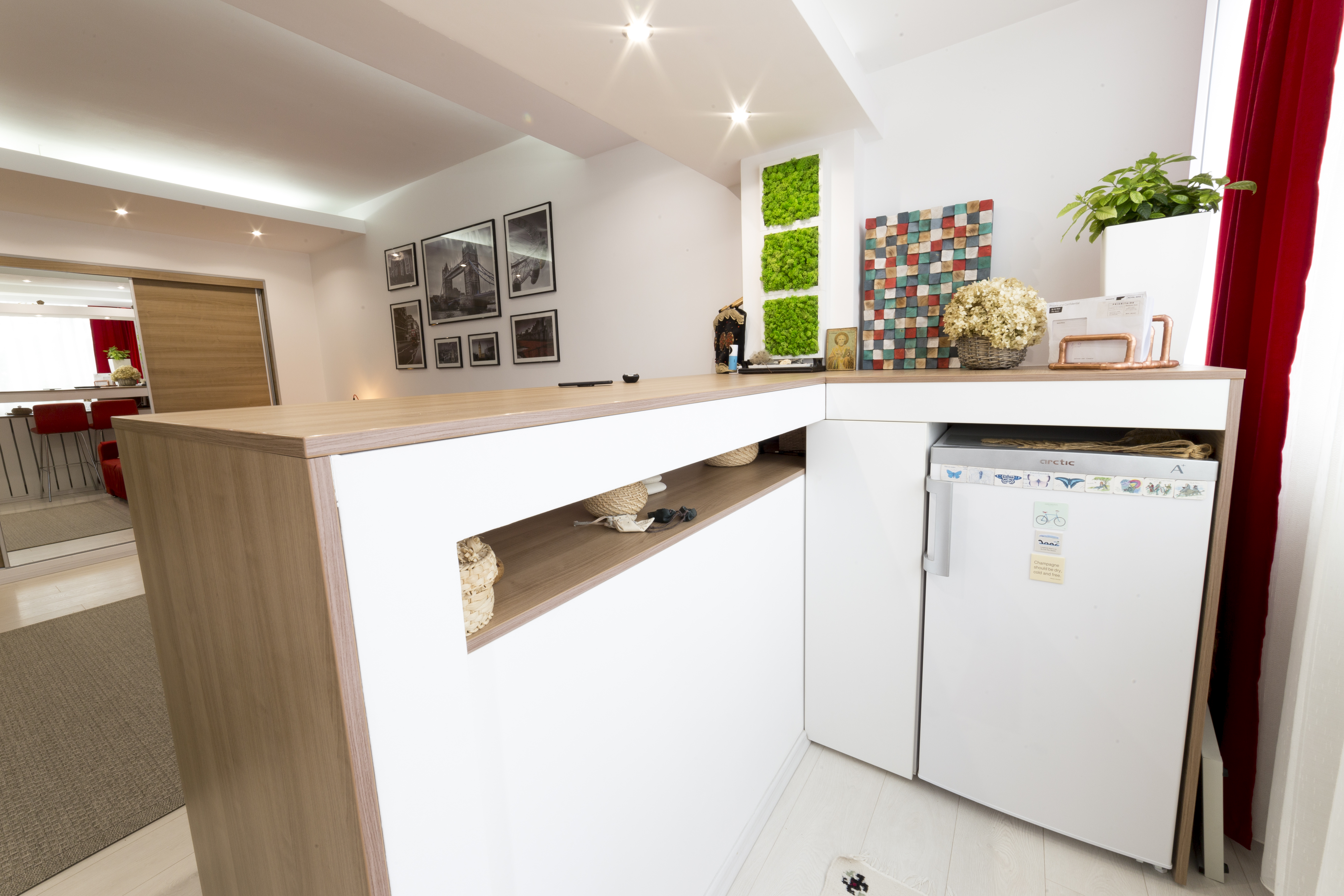 Au primit ajutor de la Bogdan Sebastian Socol, un designer român stabilit în Suedia. El s-a ocupat de tot ce înseamnă forma pereților, lumină, compartimentare, mobilier și alegerea culorilor, astfel încât spațiul de 32 metri pătrați să fie pus în valoare într-un mod inteligent și totodată să arate și frumos.