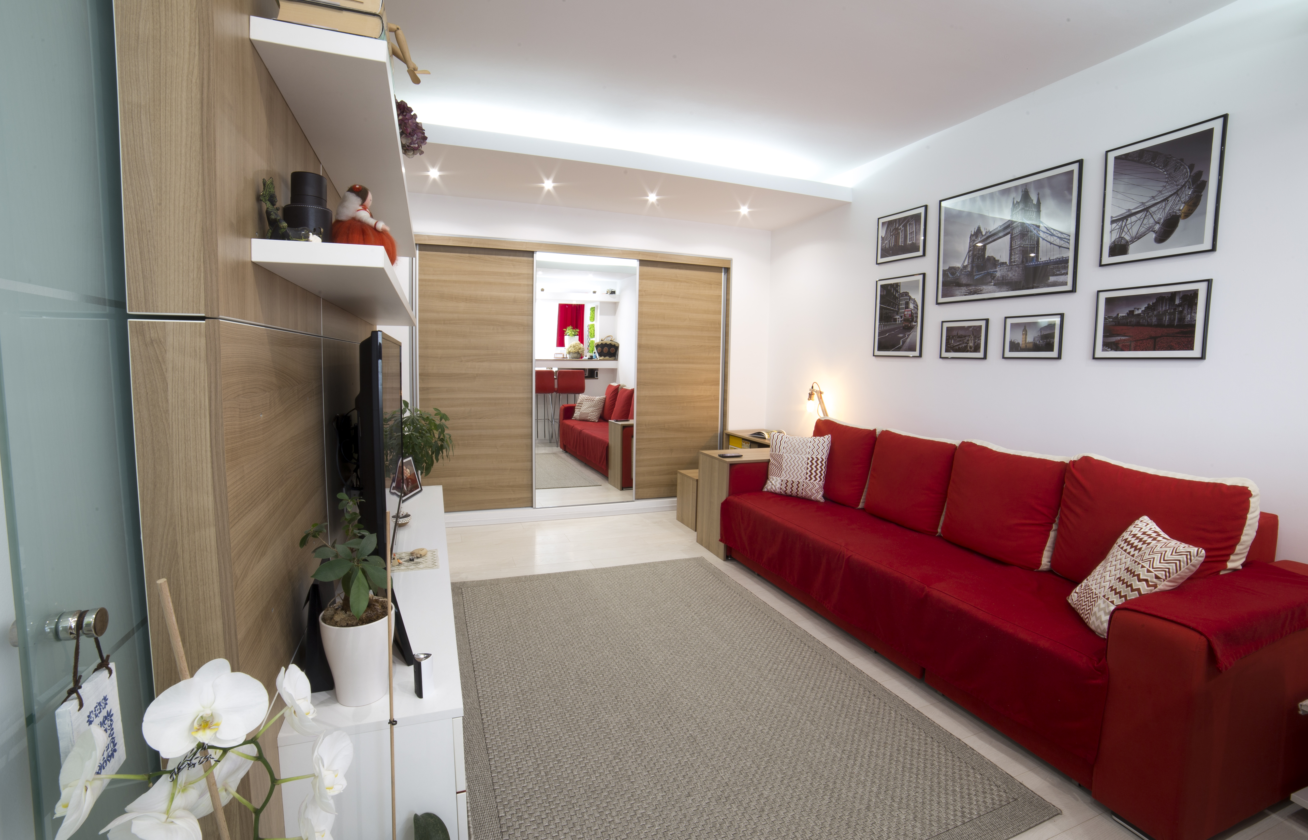 În cameră, tonurile au fost alese astfel încât să se completeze reciproc. Tavanul și pereții sunt albi, iar podeaua are tot o nuanță deschisă. Acestea contrastează cu canapeaua de un roșu aprins, care concentrează toată atenția atunci când pășești înăuntru. Balanța culorilor e echilibrată de nuanța maronie a lemnului din care care sunt realizate panoul din spatele televizorului, biroul, dulapul de haine și câteva spații de depozitare mai mici. De asemenea, depozitoarele din stuf sunt realizate manual. Pentru a păstra tonalitatea, deasupra canapelei sunt așezate tablouri alb-negru, în timp ce ghivecele cu plante mai „înverzesc” puțin atmosfera.