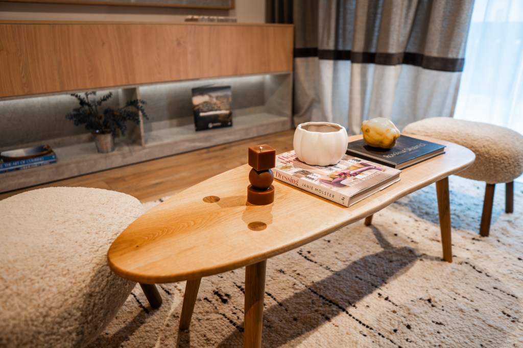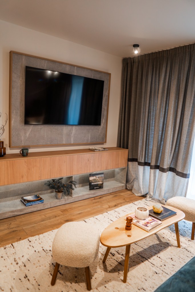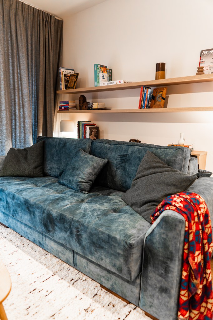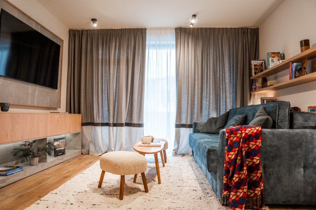 Livingul a fost una dintre cele mai sensibile zone ale proiectului. Deși contextul montan cere aproape instinctiv un șemineu, acesta nu a fost posibil din motive tehnice, fiind vorba despre un complex de apartamente. „Scopul meu principal a fost să-l transform astfel încât să fie foarte cozy, foarte confortabil, iar clienta să simtă cât mai puțin lipsa șemineului”, spune designerul.