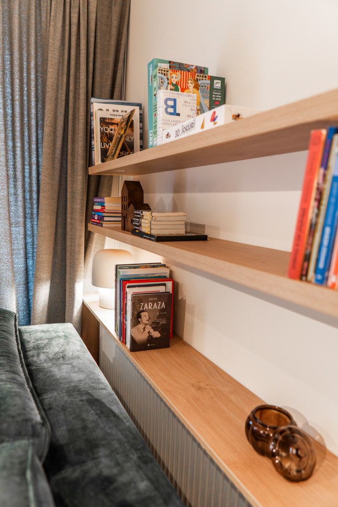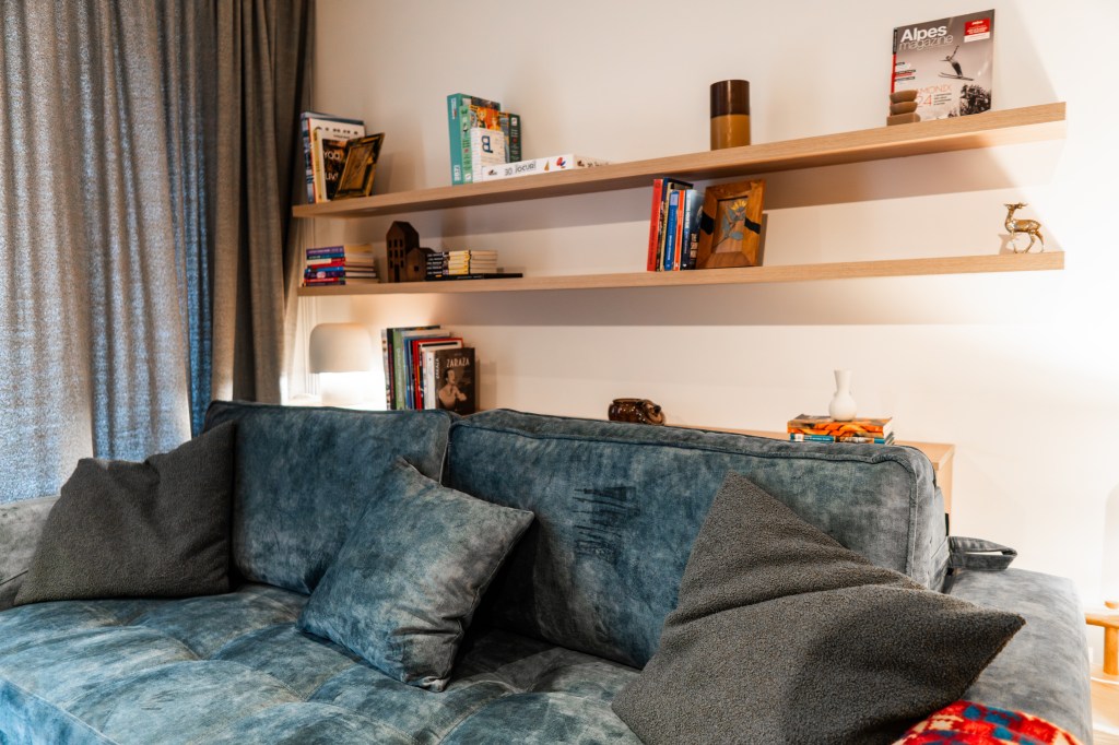 Canapeaua nu este lipită de perete — un detaliu la care Teodora ține în mod special. În spatele ei, o consolă îngustă a devenit punctul de plecare pentru un ansamblu de rafturi suspendate, transformate într-un colț de bibliotecă. Este un exemplu de soluție care rezolvă simultan estetica, funcționalitatea și nevoia de depozitare.