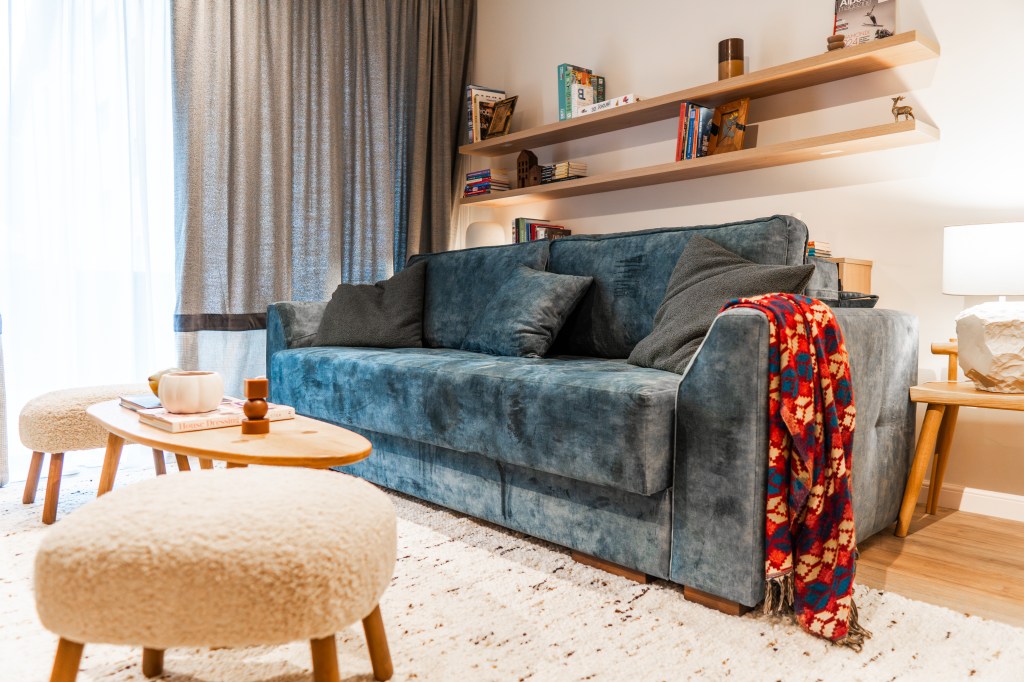 - Investește în confortul livingului, mai ales dacă îți dorești să petreci timp cu familia sau prietenii; o canapea extensibilă poate fi o alegere inspirată.