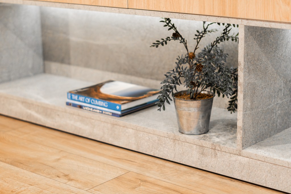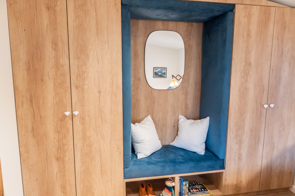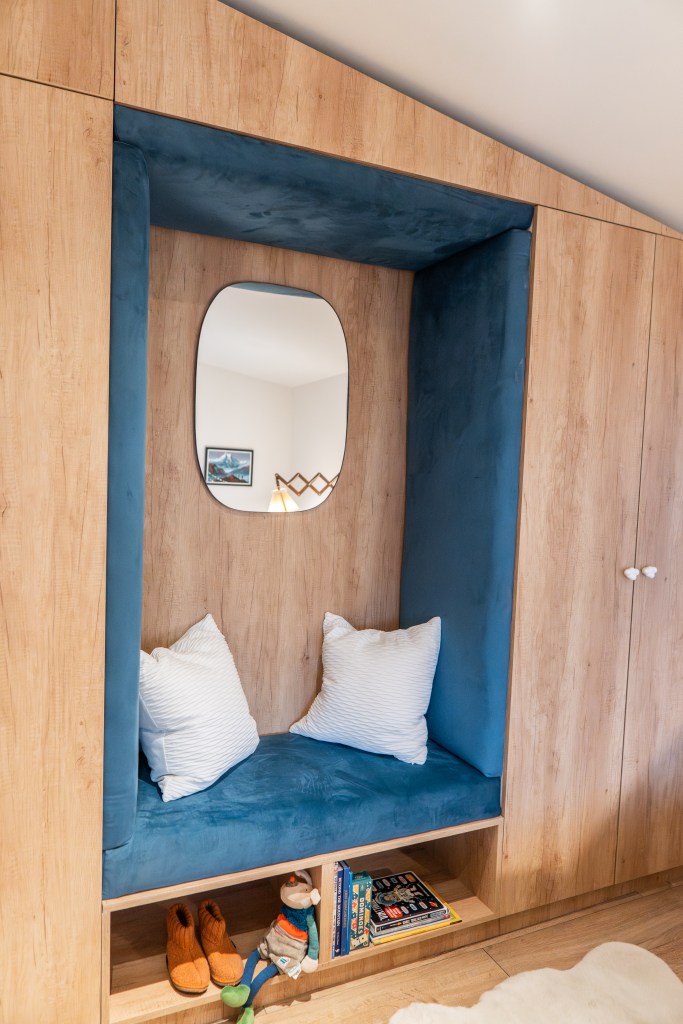 Atmosfera a fost construită prin materiale și detalii: mult lemn, texturi bogate, iluminat ambiental și o zonă decorativă care marchează locul unde ar fi putut exista șemineul. O bandă de lumină caldă, la baza peretelui, creează seara acel efect intim, specific cabanelor de munte.