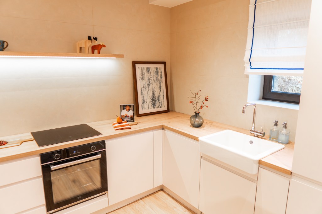 În bucătărie, Teodora a luat în considerare ritmul unei case de vacanță. Fără corpuri suspendate, fără hotă și cu spații de depozitare strict necesare, spațiul păstrează un aer minimalist și relaxat. Chiuveta cu front vizibil și mobilierul din lemn aduc o notă subtilă de rustic, potrivită contextului montan, fără a încărca vizual.