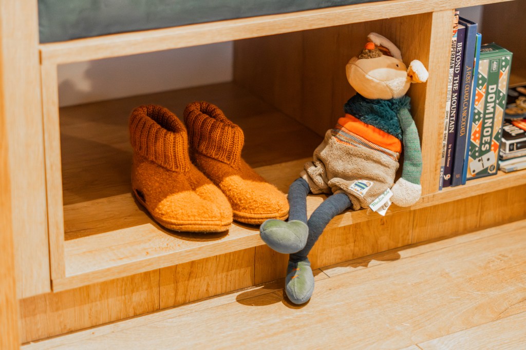 La etaj sunt cele două dormitoare. Camera copiilor, de doar zece metri pătrați, a fost organizată pentru trei copii, cu paturi modulare, spații de depozitare aerisite și un loc comun de relaxare, astfel încât fiecare să aibă senzația unui mic teritoriu personal.