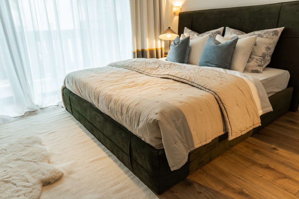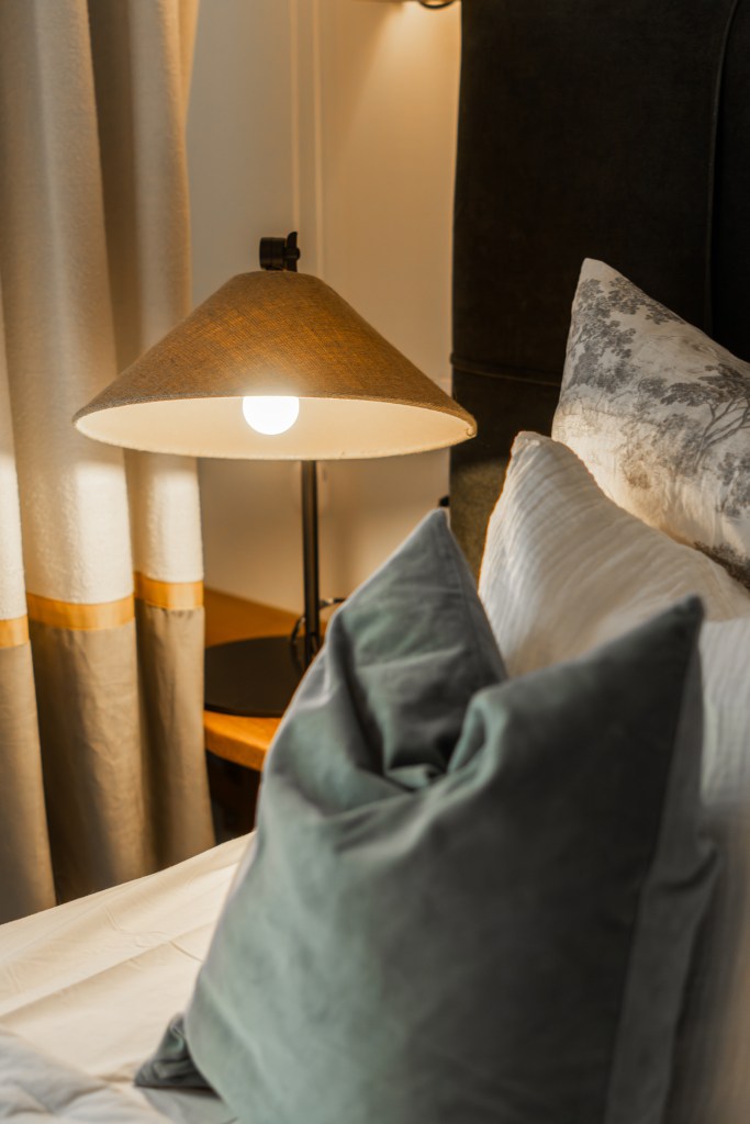 Dormitorul matrimonial este gândit ca un spațiu al liniștii absolute: mobilierul se pierde în perete, piesele sunt puține, iar accentul cade pe confort. Patul tapițat într-o nuanță de verde pădure aduce profunzime într-un decor neutru, iar textilele — multe și stratificate — încălzesc atmosfera. „Iubesc paturile cu multe layere: perne, cuvertură, pilotă. Deodată, camera prinde volum”, spune designerul.