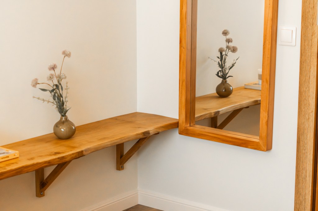 Zona de intrare, deși mică, a primit un rol clar: un spațiu de primire cu depozitare pentru haine și pantofi. Designerul a ales un corp realizat pe comandă, cu riflaj din lemn, care nu blochează lumina și adaugă textură. Piesa a fost realizată de un tâmplar specializat în design de produs, același care a realizat masa și scaunele din zona de dining, pentru un limbaj unitar în toată casa.