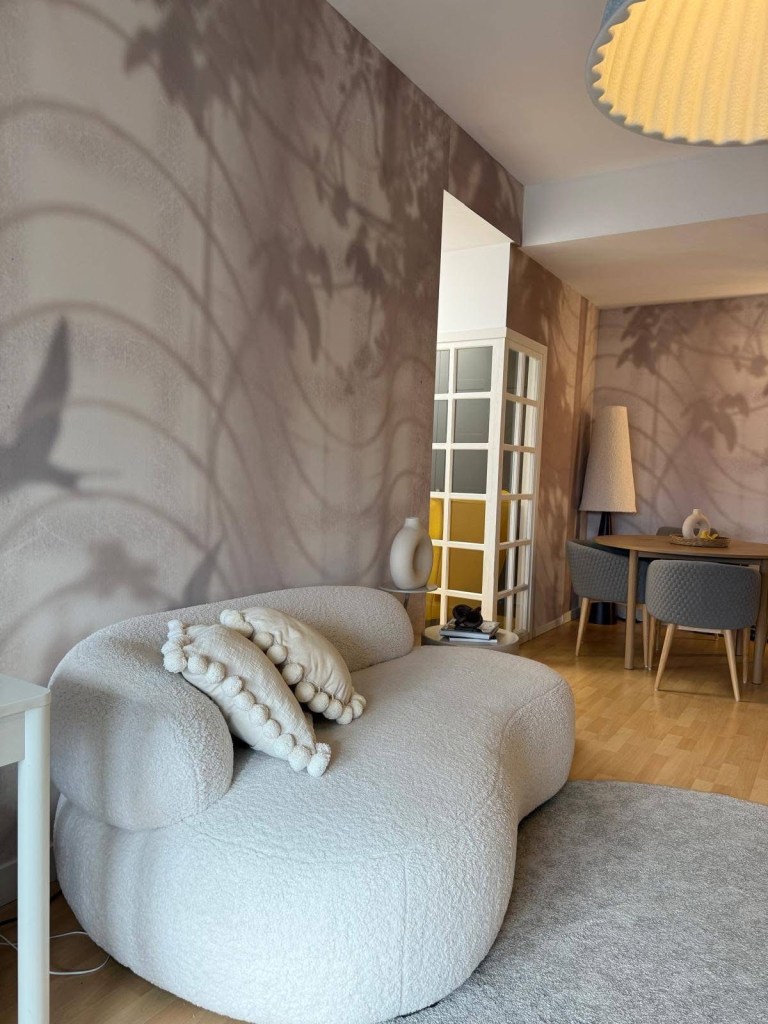 Zona de relaxare a fost mutată pe peretele opus, unde o canapea cu forme organice și textură bouclé definește spațiul de living. Covorul rotund și paleta cromatică neutră contribuie la senzația de spațiu mai amplu. Deasupra, lampa suspendată devine punctul central al camerei, adăugând un accent sculptural fără a încărca vizual spațiul.