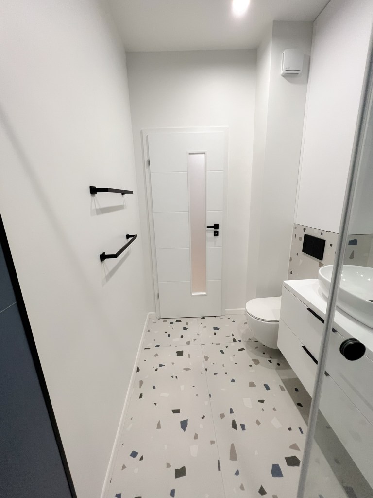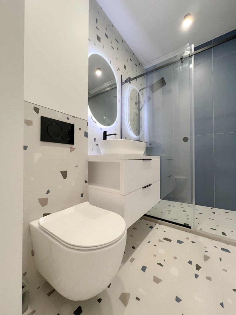 Baia este cea mai colorată încăpere din tot apartamentul. Iustina nu a neglijat nici aici principiul funcționalității, incluzând depozitări închise, care să nu atragă atenția. Gresia terazzo și faianța uni, albastru intens, fac ca spațiul să prindă viață. Este, în schimb, reluată ideea de mobilier alb cu accent de metal negru, ca lait motiv al restului casei.