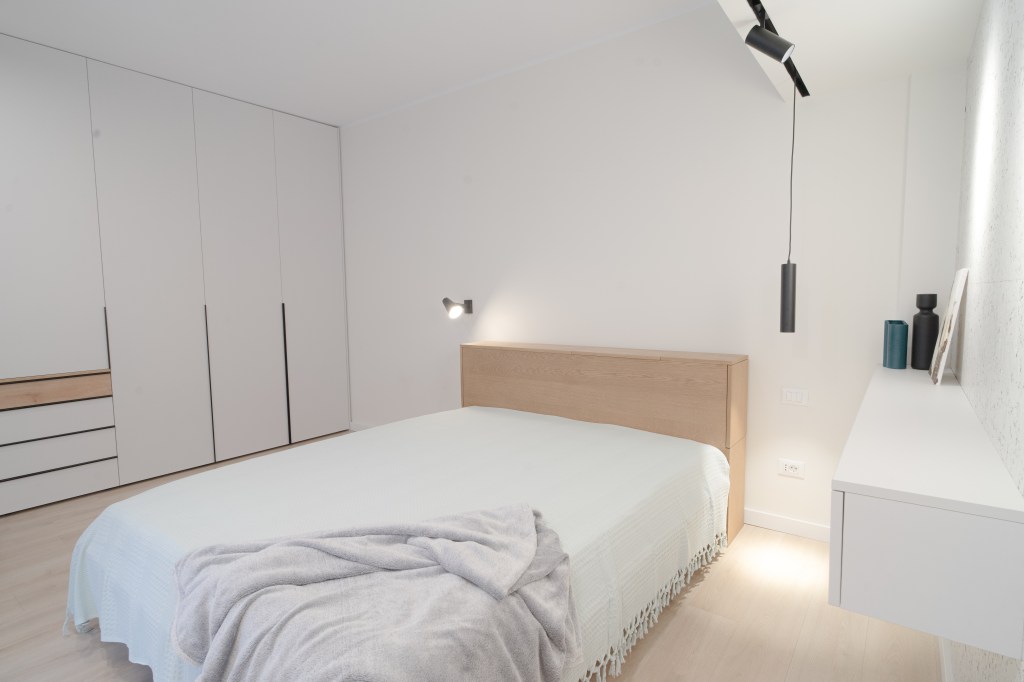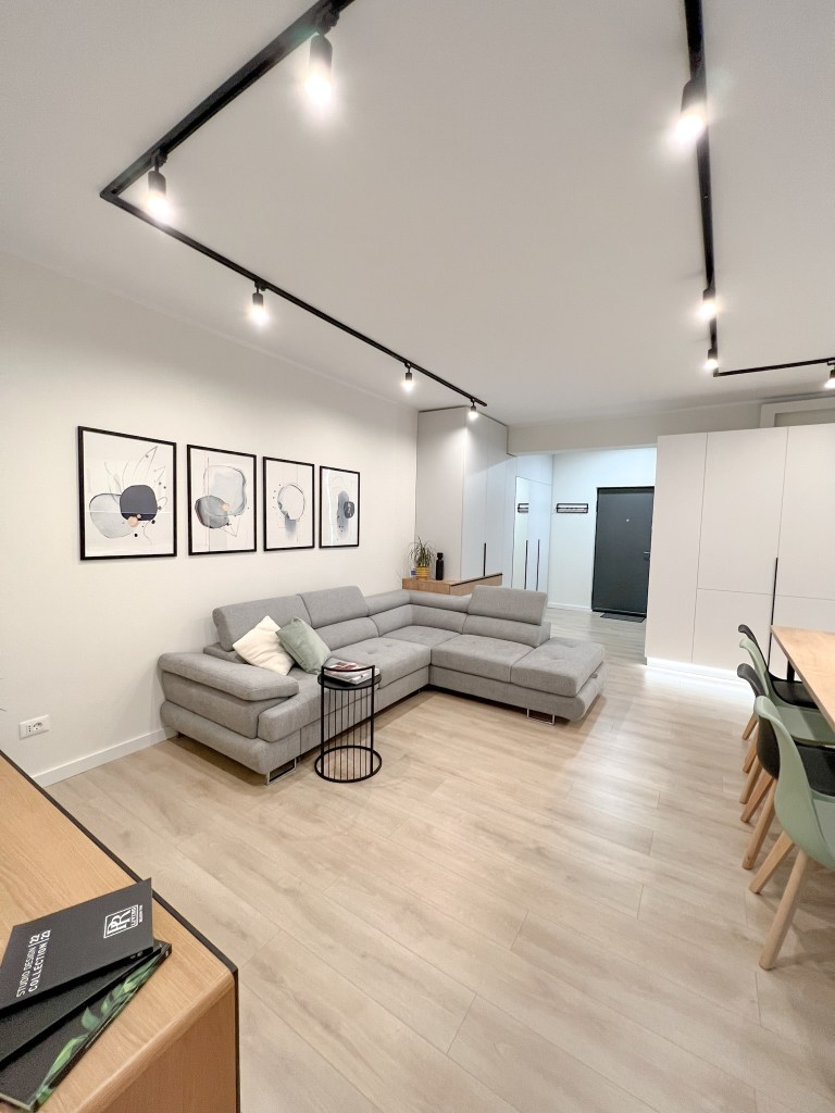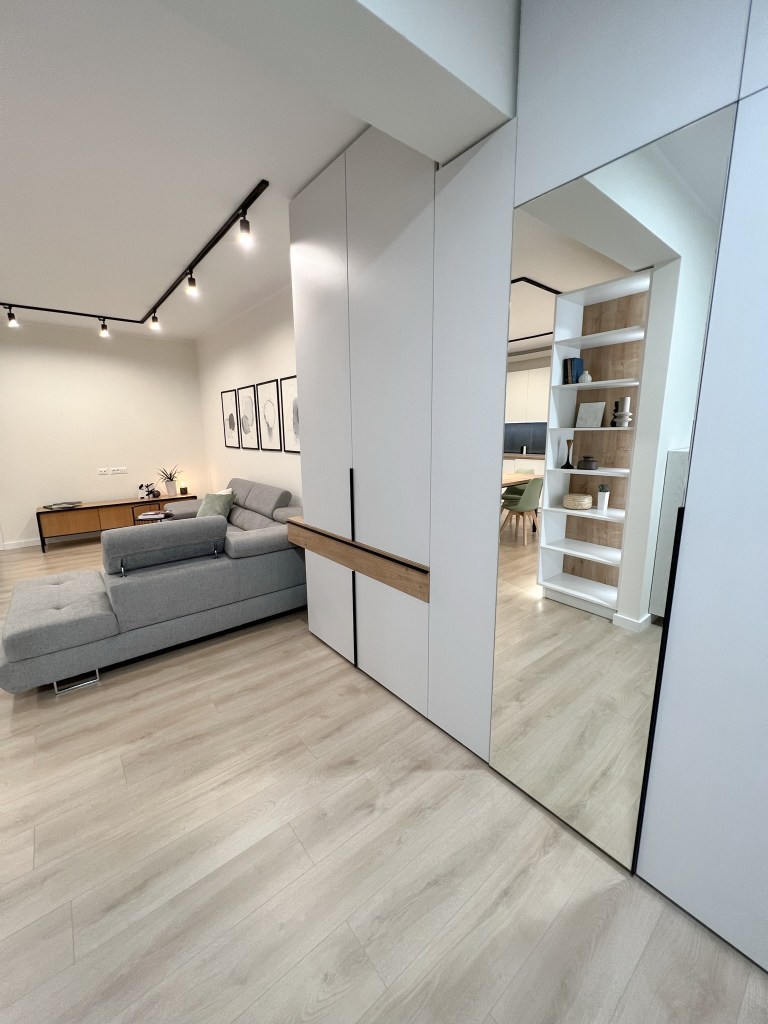 „Ventilarea spațiului a fost rezolvată prin utilizarea de aparate de ventilație cu recuperare de căldură, poziționate în ambele camere. Pentru a aduce lumină pe toată suprafața zonei de zi, am apelat la un sistem de iluminat liniar, pe șine cu spoturi, care merge șerpuitor pe toată adâncimea spațiului. Un alt mod de a amplifica lumina a fost paleta cromatică, cu suprafețe în general albe sau foarte deschise și suprafețele reflectorizante – oglinzile din hol”, explică Iustina.
