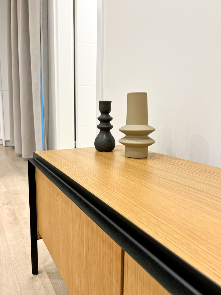 Depozitările sunt închise, în marea lor majoritate, pentru a păstra interiorul cât mai curat din punct de vedere estetic. Canapeaua este extensibilă pentru a suplimenta spațiul pentru dormit, la nevoie. O piesă statement în living este comoda TV din lemn de stejar, de la Kave Home, care atrage atenția prin materiale și liniile ușor rotunjite, în contrast cu restul pieselor din încăpere.