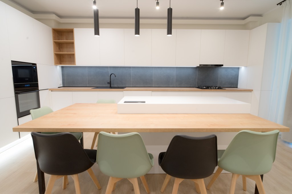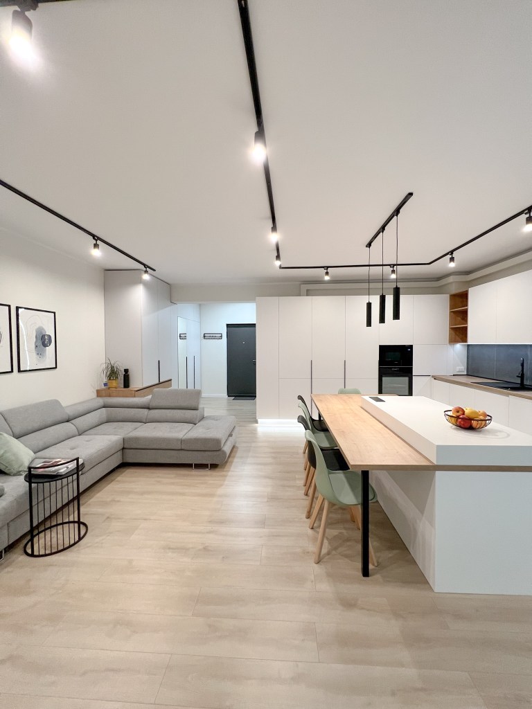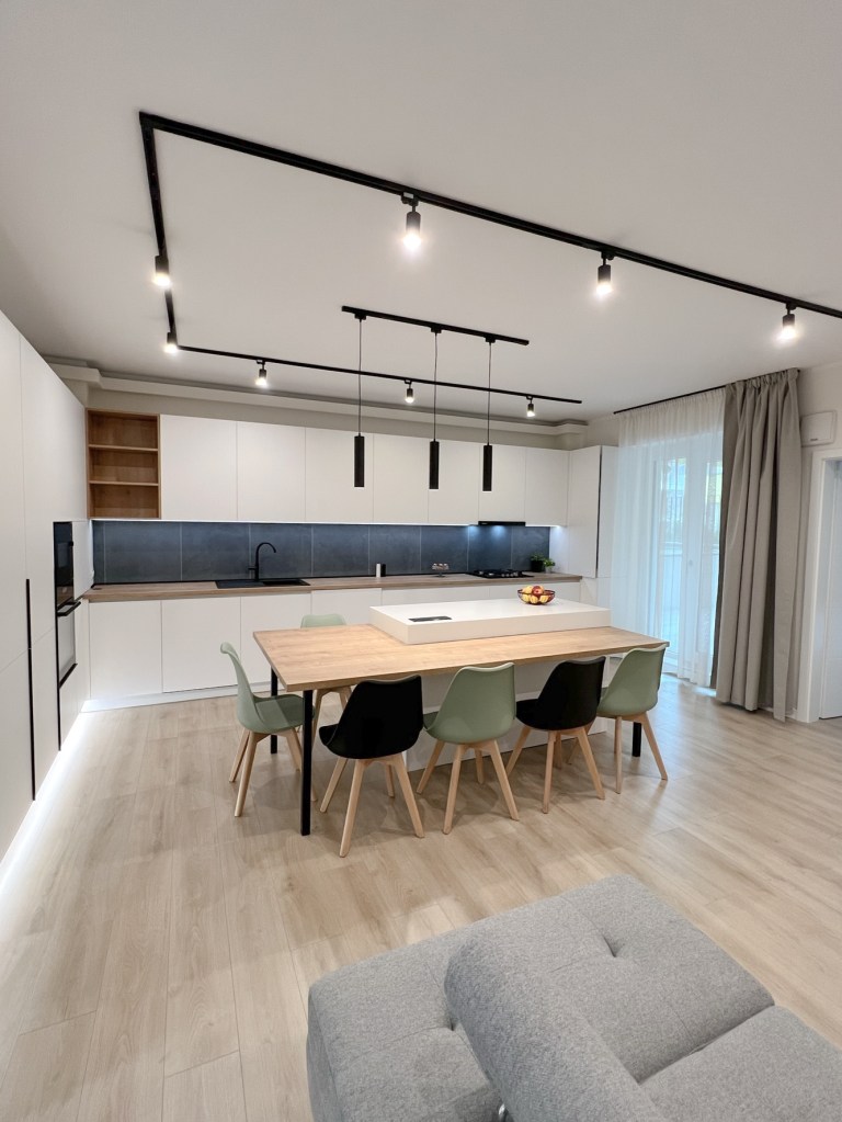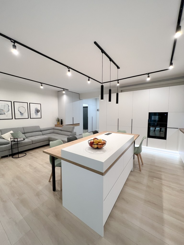 Zona de zi, alcătuită din bucătărie și living, pune accent pe funcționalitate, fără a da senzația de aglomerare. Mobilierul general este realizat pe comandă pentru a utiliza la maxim spațiul disponibil și a fost furnizat de Geometriq. Iustina a optat pentru linii simple și moderne, mânere ascunse sau cu aspect discret și inserții din lemn, menite să aducă un plus de căldură decorului minimalist. A folosit pentru contrast iluminatul tehnic, care are și rol decorativ.