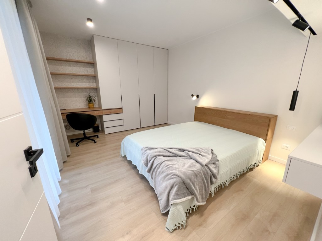 În dormitor, grinda de deasupra intrării, poziționată pe un rost al clădirii, a influențat conceptul de amenajare. Zona a fost îmbrăcată în rigips și scoasă în evidență ca o „ramă” care încadrează un perete decorativ îmbracat în plăci de plută – iluminat prin spoturi orientabile pe șina magnetică. Iustina a folosit aceeași plută pe peretele cu biroul, pentru un plus textural, dar și ca material fonoabsorbant. Proprietarii nu au vrut covoare, ca să nu afecteze eficiența încălzirii prin pardoseală. Materialul fonoabsorbant are și rolul de a genera mai mult confort acustic în încăpere. Pornind de la ideea de spațiu multifuncțional, Iustina a proiectat și o mică zonă de birou, în continuarea dressingului. Patul din lemn masiv este piesa de rezistență din dormitor. Este, de altfel, și cel mai mare răsfăț al întregii amenajări.