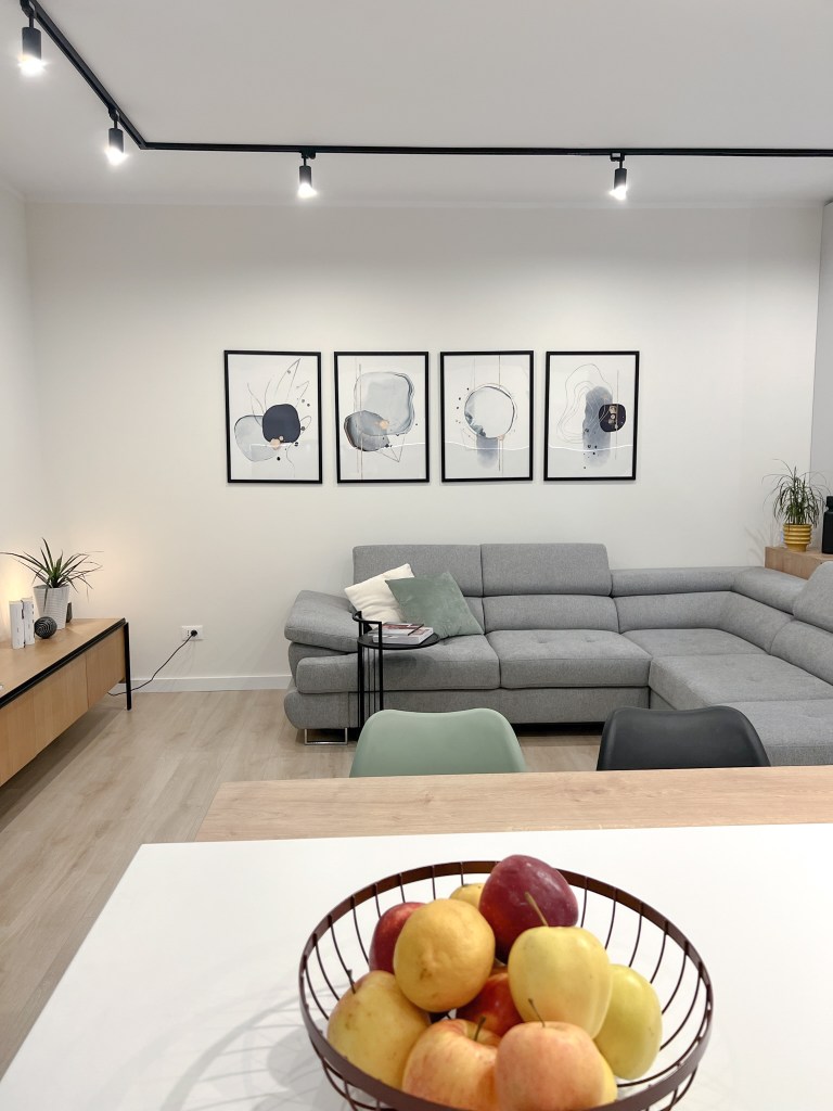 „Apartamentul este amenajat în stil contemporan, cu înclinație spre minimalism. Forma finală a acestui proiect rezonează foarte mult cu propriile preferințe în materie de design, iar faptul ca proiectul inițial se regăsește în implementare îmi aduce mare bucurie. Motto-ul AIR Design este estetic, funcțional, confortabil. Pun mare preț pe primarea funcțiunii și a utilitarului. Direcția proiectelor mele este spre simplitate, utilitate, confort, lumină și natural. Pornind de la un funcțional corect, care îndeplinește cerințele de utilizare a spațiului, putem apoi gestiona preferințele de ordin estetic și stilistic”, spune Iustina.
