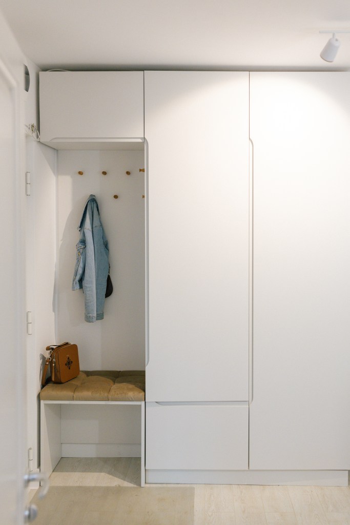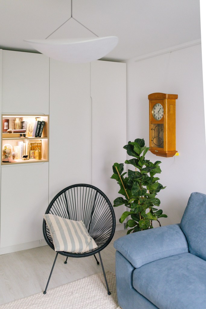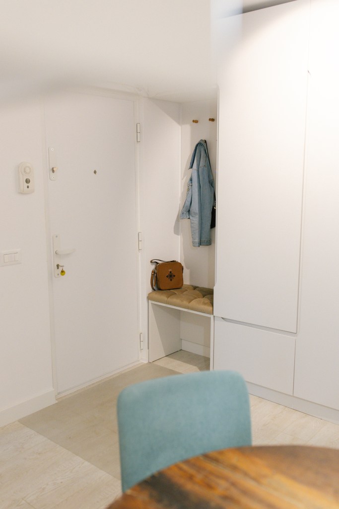Conceptul de amenajare al apartamentului este influențat de minimalismul din nordul Europei, cel puțin pe partea de funcționalitate. Corina a călătorit de două ori în Norvegia și a fost cucerită de stilul lor ușor auster, cu linii clare și forme ample. A păstrat ideea de spațiu aerisit și luminos, depozitări eficiente și obiecte cât mai puține. A adăugat însă căldură prin accente discrete de culoare și piese de suflet, pe care a vrut neapărat să le aibă la vedere. Bucătăria și holul, care sunt gândite ca un open-space, cu cromatică neutră și accente de gri colorat, cum îl numește Corina. De fapt, tot apartamentul este unul cu fundal deschis, ceea ce face ca spațiul să pară mai luminos.