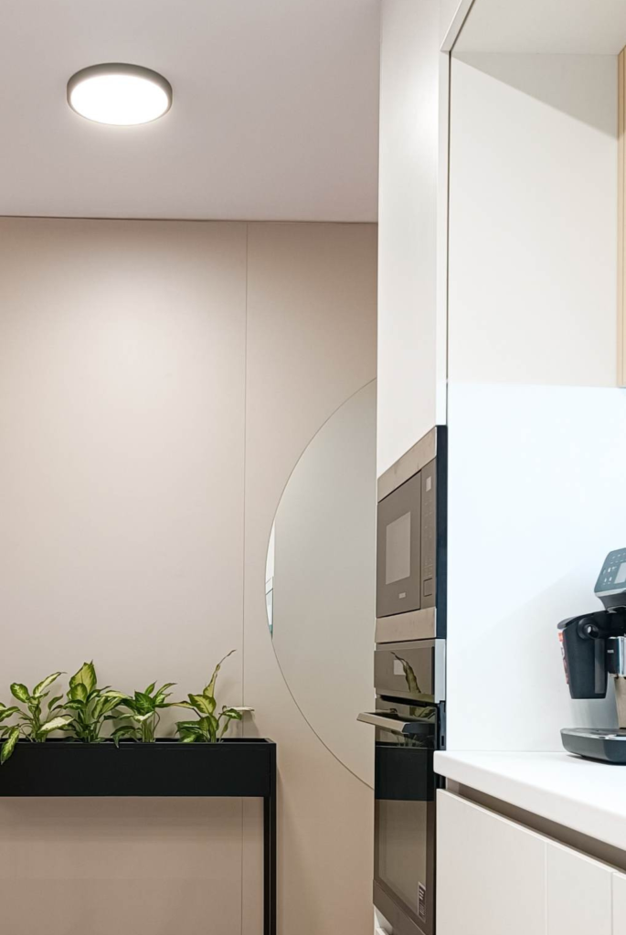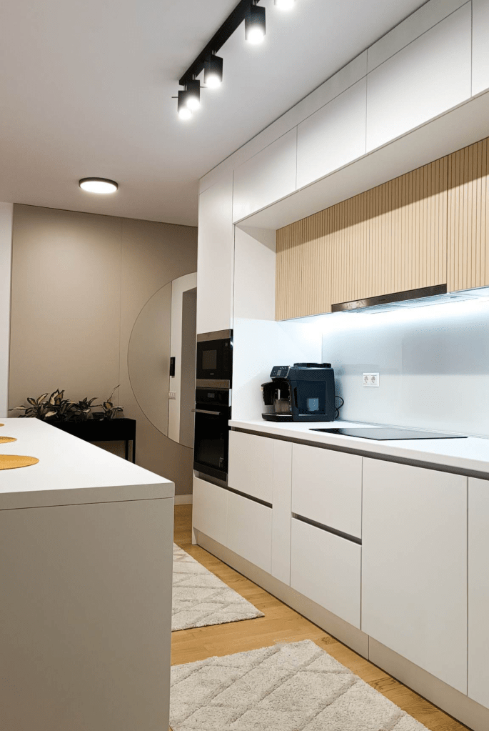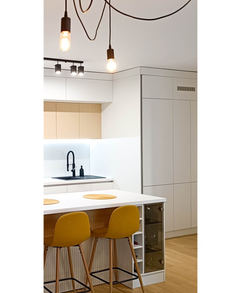 „Noi ne-am ocupat nu doar de proiectarea, ci și de execuția mobilierului”, povestește Sorina. „Ideea a fost să găsim o formulă care să asigure un echilibru mulțumitor între estetic și funcțional. Am mers pe linii simple, moderne care să reflecte stilul de viață al proprietarului. Ne-am folosit de diverse trucuri pentru a păstra amenajarea cât mai aerisită: culori deschise, mânere ascunse, electrocasnice incorporabile”.