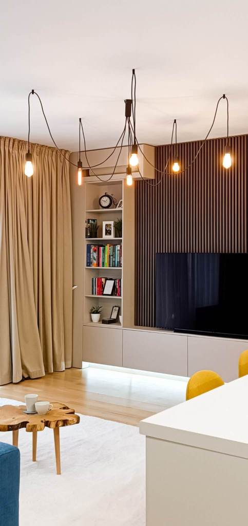 „Zona de zi este spațioasă, are o suprafață de 43 metri pătrați. Cu toate acestea, am încercat să nu o sufocăm cu mobilier. Am mers pe corpuri înalte până în tavan, fără mânere, pentru o amenajare curată și modernă. În living, am optat pentru depozitare minimală și am alternat corpurile închise cu cele deschise. Peretele din spatele televizorului l-am acoperit cu riflaje pentru a obține un element de focus. A fost o soluție care ne-a permis și să mascăm aparatul de aer condiționat care avea o evacuare inestetică”, spune Sorina.