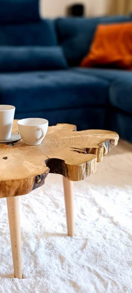 Scaunele pentru insulă sunt achiziționate de la The Home. Măsuța de cafea din lemn este de la Wood Working Pampam, iar canapeaua de la Somproduct. Corpurile de iluminat sunt de pe www.luminam.ro, iar jardiniera este realizată în atelierul celor de la Legacy Design Craft.