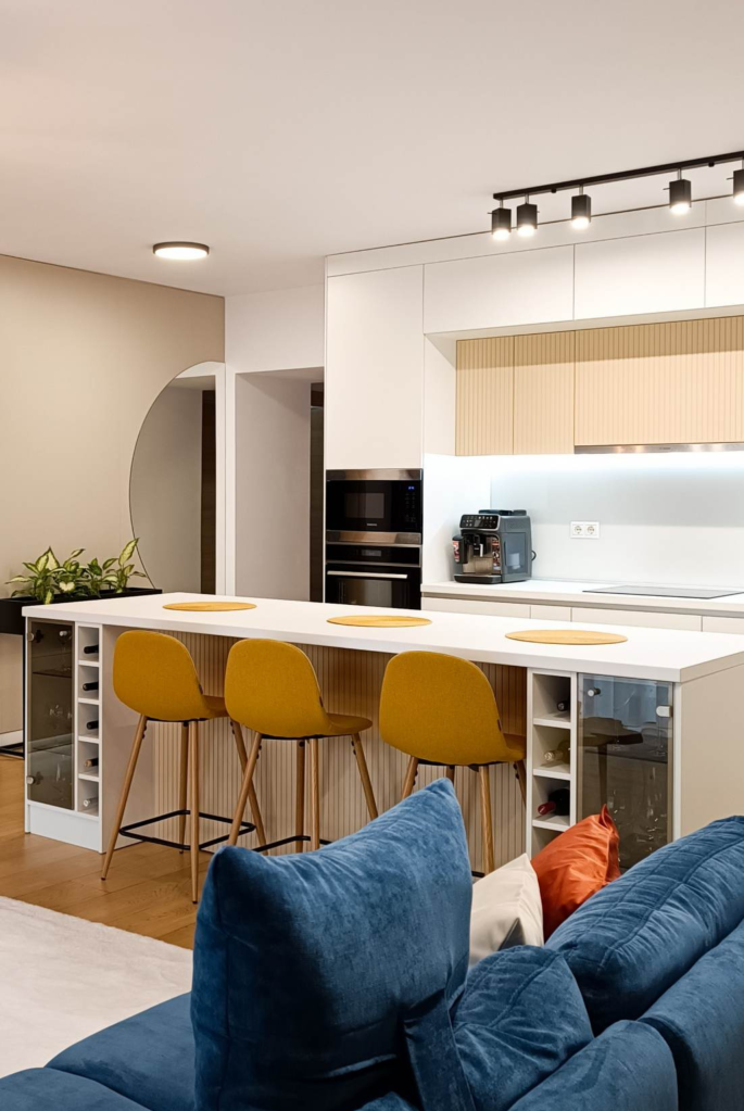 Open space-ul a fost proiectat ca un spațiu cu multiple funcțiuni, dar s-a dorit ca zonele să aibă o comunicare firească. Delimitările sunt subtile, realizate, de obicei, cu ajutorul corpurilor de iluminat sau a pieselor de mobilier. Trecerea dintre bucătărie și living este marcată de o insulă tip bar, o cerință menționată încă de la primele discuții avute cu proprietarul. Riflajul este un element care se reia, atât în bucătărie, cât și în zona de living, lucru care ajută la conturarea unui aspect unitar. În ceea ce privește cromatica folosită, Sorina și Ionuț au mers pe nuanțe neutre pe care le-au vitalizat prin accente de culoare. Au reușit să imprime căldură spațiului și prin texturile folosite: canapeaua catifelată, perdelele din voal de mătase, măsuța din lemn, cu formă organică. Pentru contrast, au folosit corpurile de iluminat ușor industriale și electrocasnicele negre.