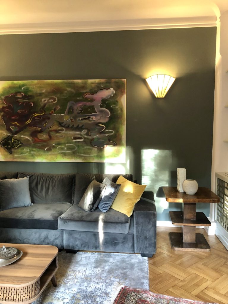 Mai sunt câteva obiecte cu poveste care merită menționate aici. Tabloul din spatele canapelei este o lucrare în ulei, realizată de tânărul artist Christian Roncea. A fost comisionat special pentru acest spațiu, în racord cu stilul interior și culorile alese. Alte piese de suflet sunt covorașul persan din mătase, vechi de 200 de ani și cei doi câini Fu, cumpărați de Mirela în timpul unei călătorii în Singapore. În cultura asiatică, sunt considerați protectori ai casei.