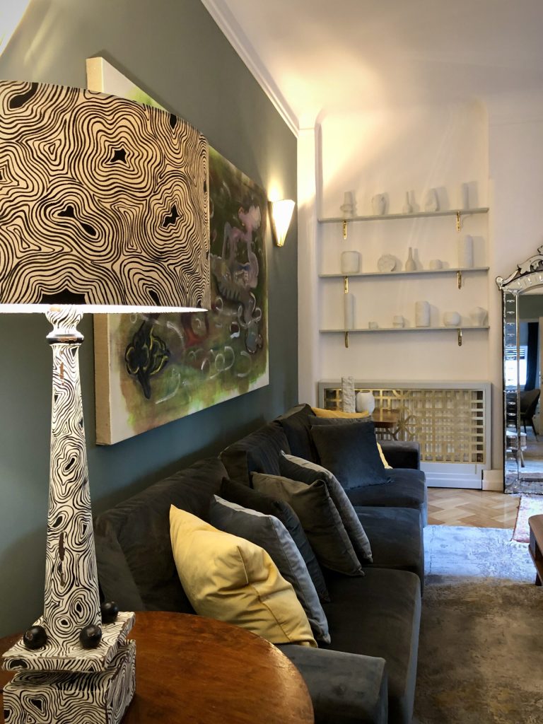 Amenajarea livingului a fost ghidată de găsirea unui echilibru între estetic și funcțional. Decorul include aici mai multe elemente statement: măștile de calorifer din alamă, colecția de vaze Kaiser din porțelan biscuit pe care Mirela o upgradează ori de câte ori are ocazia, oglinda venețiană care nu își găsea loc pe nicăieri. Este încăperea în care se vede cel mai bine mixul de stiluri și de generații.