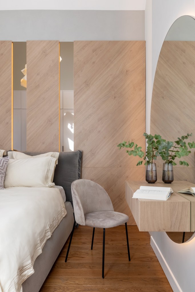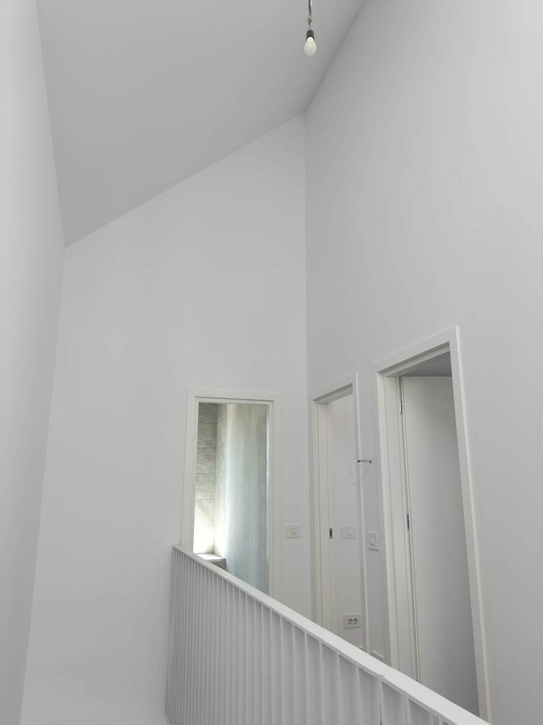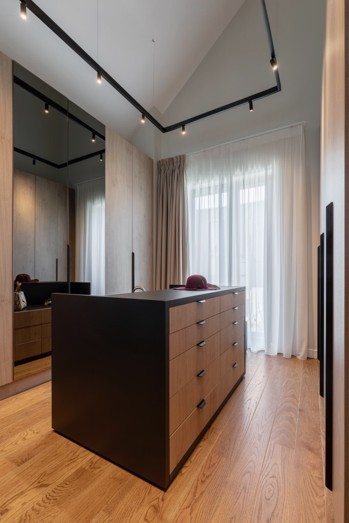 La cel de-al doilea nivel al casei, arhitectura este punctul focal. Șarpanta expusă este evidențiată prin construcția unui panou de gips-carton cu un finisaj particular. Benzile led laterale au fost folosite pentru a amplifica înălțimea spațiului. La fel și o oglindă circulară mare ce reflectă spațiul ambiental. Fiind un dormitor de oaspeți, s-a mers pe o cromatică neutră, atenția fiind îndreptată pe elementele de arhitectură ale încăperii.