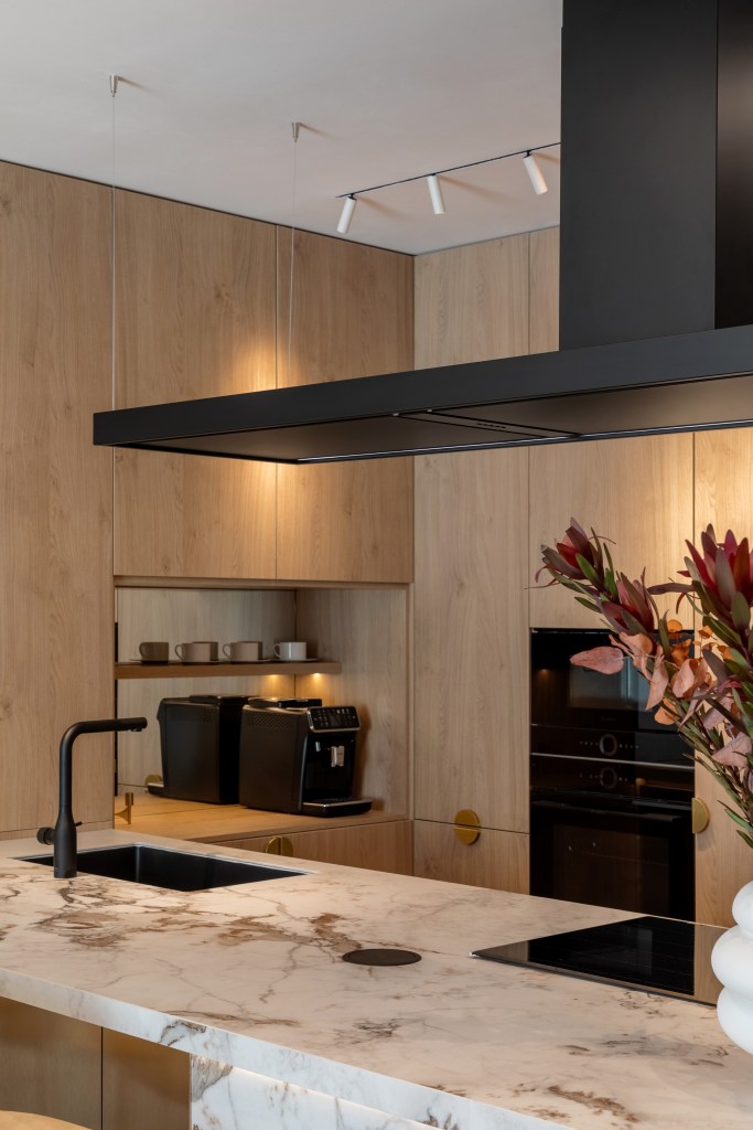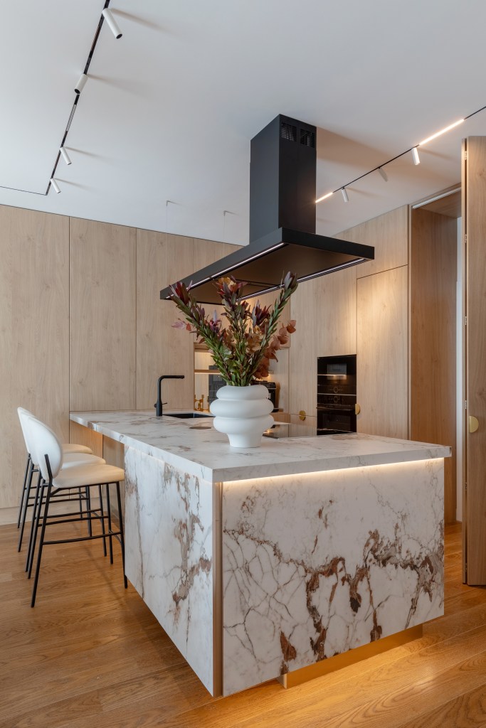 Zona de open-space, care se află la parterul casei, este compusă din bucătărie și dining. În bucătărie, spațiul de depozitare este generos, dar proiectat într-o manieră care să nu lase nimic la vedere. Un detaliu interesant aici: ușile de acces către încăperile de deservire sunt camuflate în mobilierul înalt până în tavan. Peninsula de bucătărie, marcată prin multiple accente prețioase și prin hota suspendată de mari dimensiuni, are linii simple, minimaliste și servește ca fundal discret pentru piesele de design folosite în amenajare.