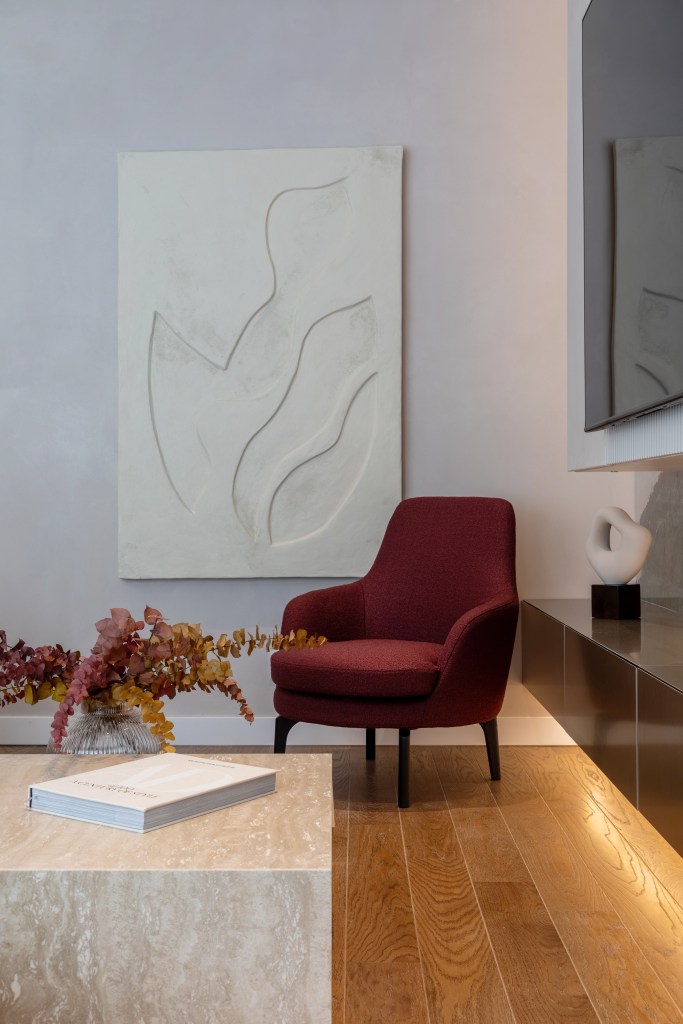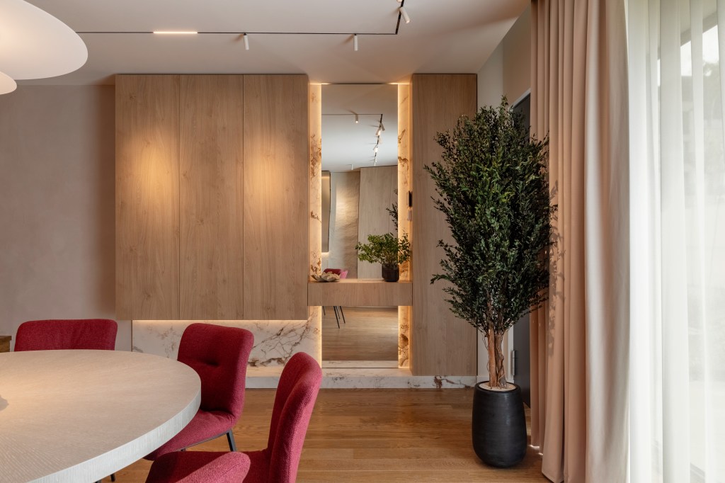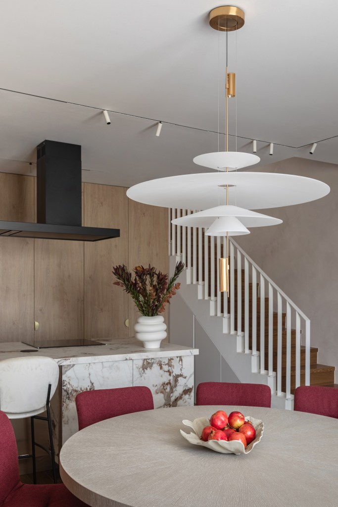 Din punct de vedere cromatic, accentele de roșu învăluie întreaga încăpere, fie că e vorba despre venatura placărilor ceramice, tapițeria scaunelor sau culoarea fructelor de pe masă. Lumina caldă și texturile contrastante definesc decorul. O piesă statement este corpul de iluminat spectaculos, amplasat deasupra mesei din dining.