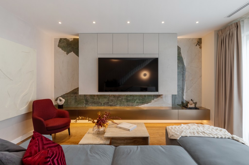 „În living, am schimbat registrul cromatic. Am încercat să introducem trimiteri naturale într-o casă în care plantele vii nu erau o opțiune (proprietarul plecat mare parte din an). Astfel, verdele devine dominant – prin placajul ceramic îndrăzneț de la zona TV, plante stabilizate în jardinieră și contrastul puternic asigurat de fotoliul roșu, ca un fruct copt într-un frunzis luxuriant”, spune arhitecta Mihaela Solon.