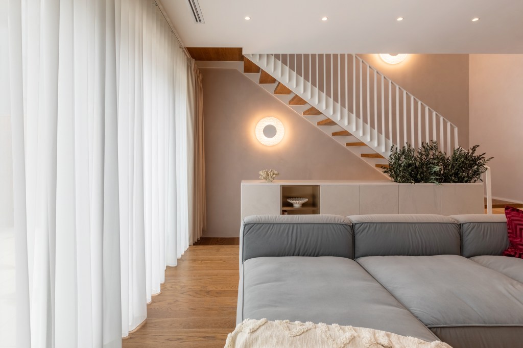 Cea mai mare provocare a șantierului a fost absența unei zone desemnate de hol. Practic, accesul principal în casă se face în parter, direct în zona de zi. A fost nevoie de o soluție custom care să rezolve problema funcționalității și care să se integreze cât mai discret în decorul elegant al dining-ului. Complicată a fost și relația cu echipa de șantier. Multe lucruri nu au ieșit perfect din prima și au fost necesare retușuri și intervenția altor persoane și a altor specialități pentru a obține rezultatul final.