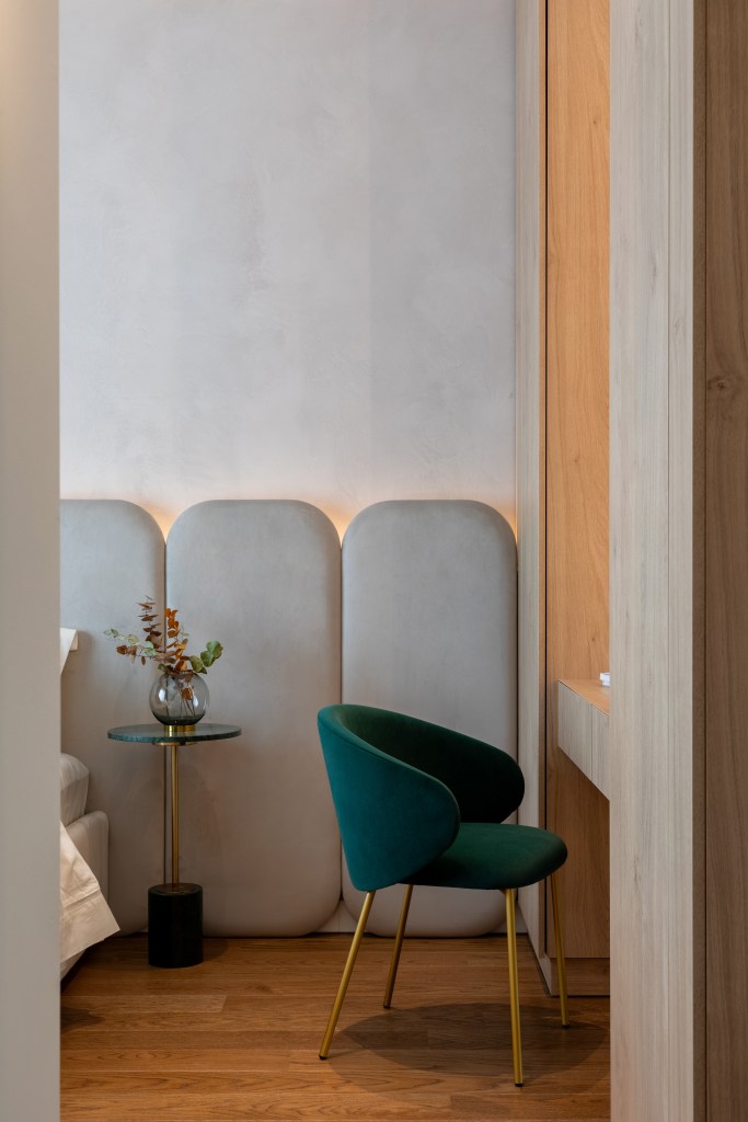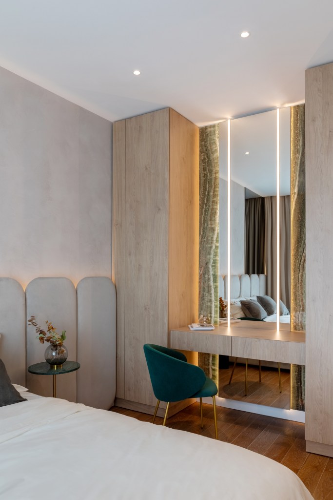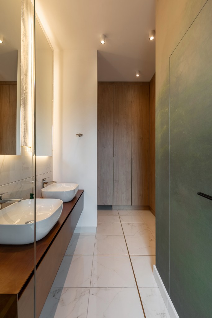 Accentele de verde continuă și în decorul dormitorului matrimonial, situat la același nivel. Ceramica verde din spatele oglinzii este, ca și în living, un element spectaculos de design. Noptierele din marmură sau tapetul cu imprimeu vegetal sunt detalii care susțin, la rândul lor, cromatica propusă pentru această încăpere.