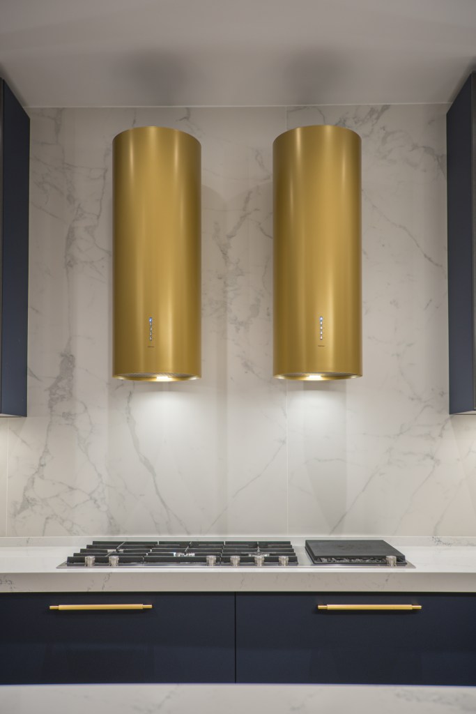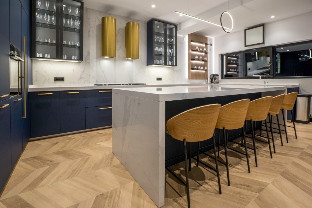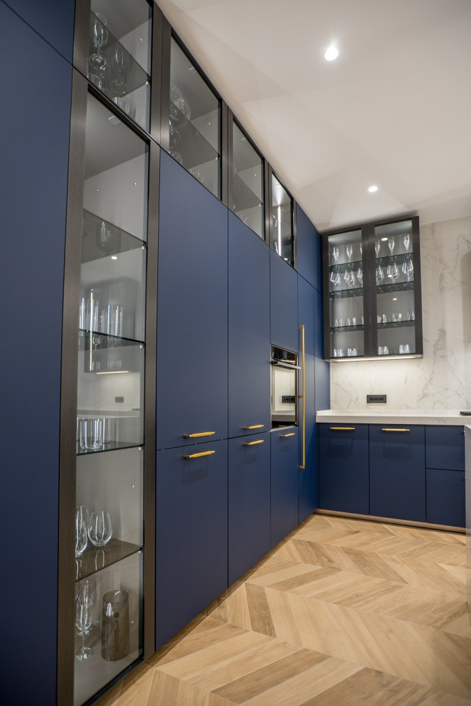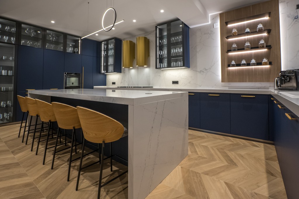 Bucătăria este vedeta amenajării, fiind cel mai colorat colț al casei. Este o încăpere de 30 metri pătrați, cu o insulă generoasă în jurul căreia se adună toți membrii familiei. Albastrul mobilierului este completat de accentele aurii, folosite la nivel de accesorii, iar lemnul este inserat și el, pe alocuri, pentru a aduce căldură. Din punct de vedere al stilului propus, Ana a mers pe linii moderne și pe acest joc al contrastelor care a ghidat, de altfel, tot conceptul de amenajare. Vitrinele cu ramă metalică și sticlă fumurie sunt zone de display. Au rolul lor de a sparge monotonia mobilierului închis și de a aduce un plus de valoare estetică. Întreaga încăpere este gândită ca un loc destinat familiei. Amenajarea a costat 50.000 euro, incluzând aici și electrocasnicele din gama premium de la Falmec și Neff.