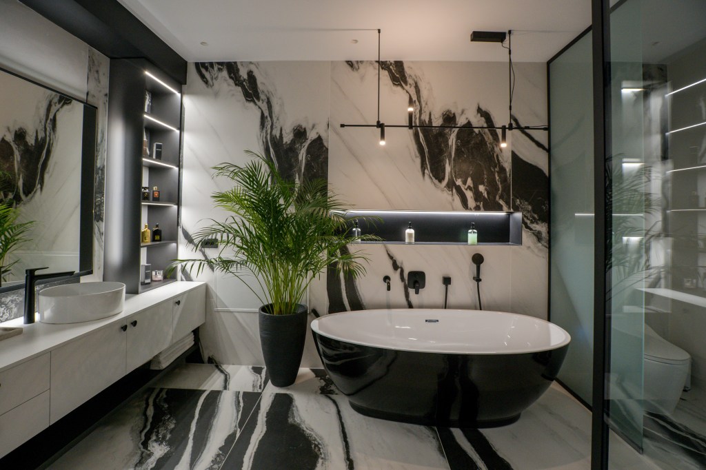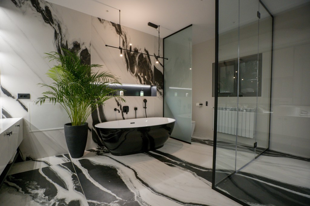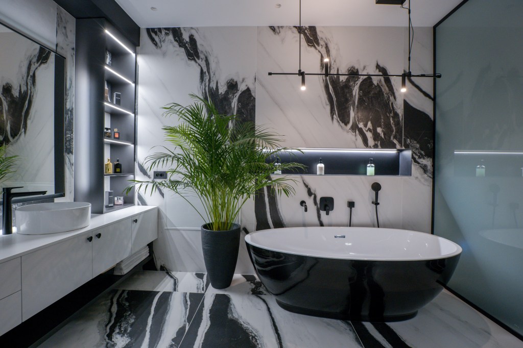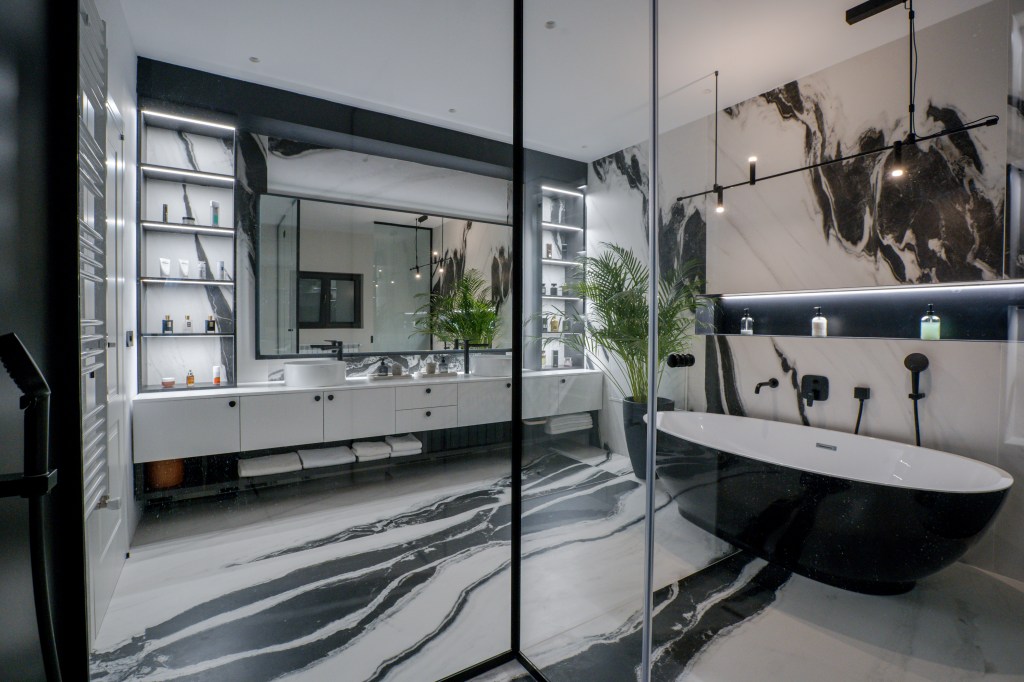 „Baia matrimonială a suferit transformări majore”, explică Ana. „Am schimbat poziția sanitarelor. Apoi am mărit spațiul prin demolarea celei de-a doua zone de dressing care se afla inițial pe planul arhitectural. Am ajuns la un rezultat spectaculos unde am avut suficient loc pentru toate piesele. Am reușit să integrăm duș dublu, cadă freestanding, toaletă smart și două lavoare cu spațiu generos de depozitare ”.
